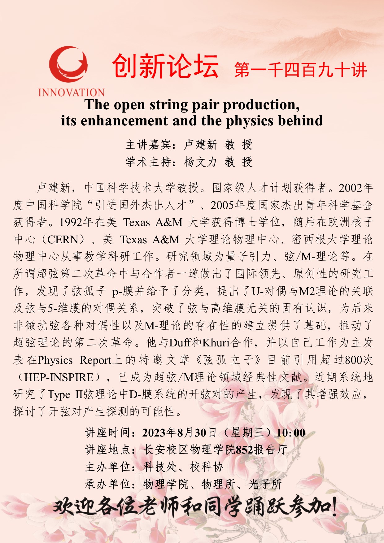卢建新 教授 开云手机网页版登录入口创新论坛第一千四百九十讲:The open string pair production, its enhancement and the physics behind 讲座时间 2023年8月30日(星期三)10:00 讲座地点 长安校区物理学院852报告厅 讲座人介绍 卢建新 教授 讲座内容