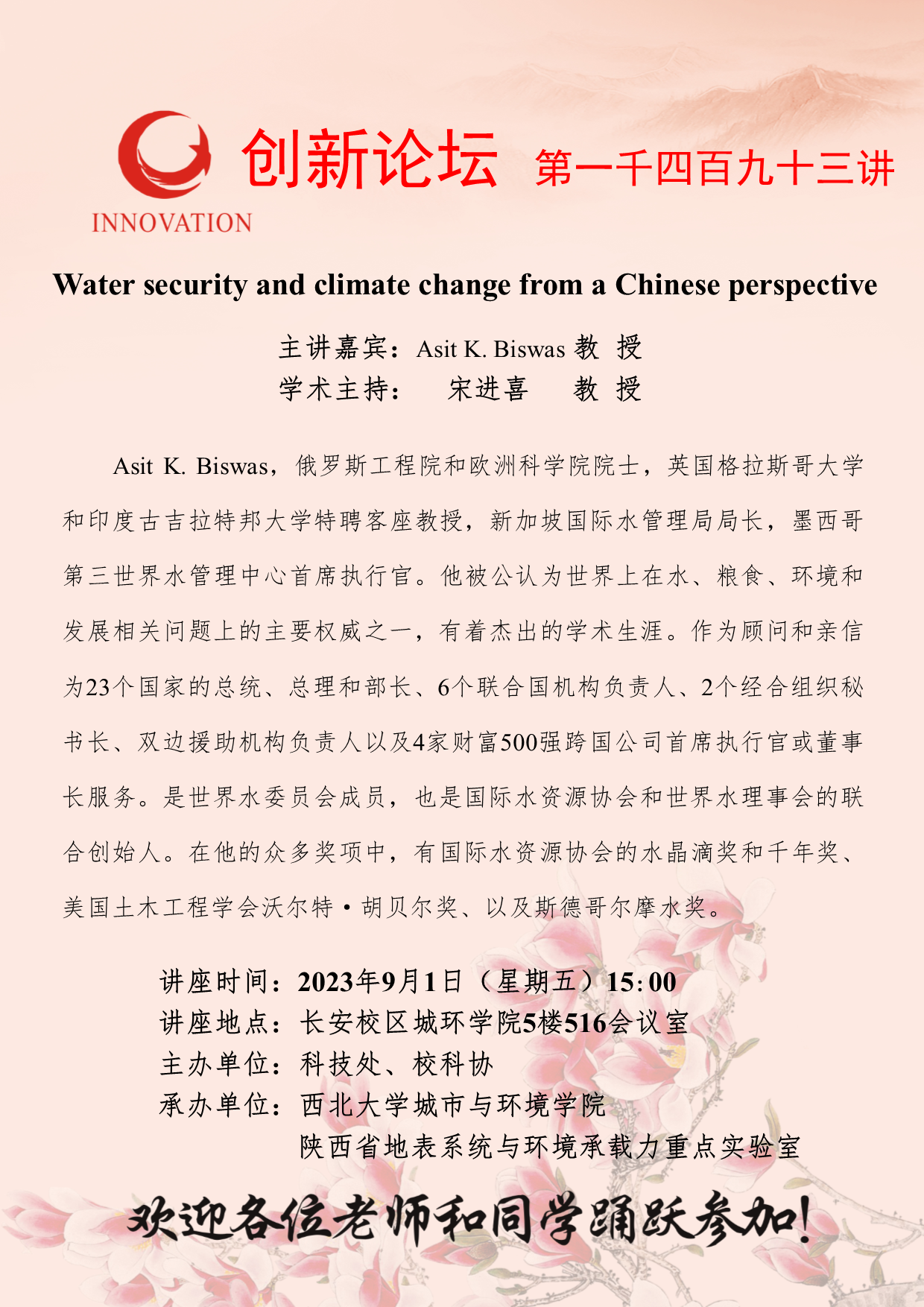 Asit K. Biswas 教授 开云手机网页版登录入口创新论坛第一千四百九十三讲:Water security and climate change from a Chinese perspective 讲座时间 2023年9月1日(星期五)15:00 讲座地点 长安校区城环学院5楼516会议室 讲座人介绍 Asit K. Biswas 教授 讲座内容