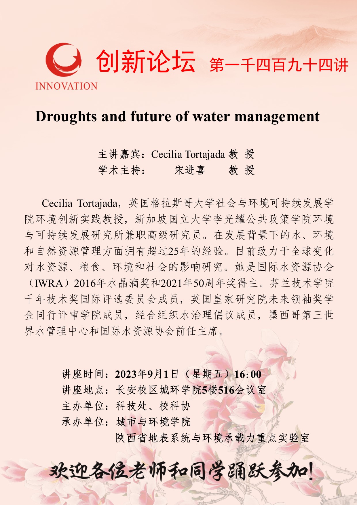 Cecilia Tortajada 教 授 开云手机网页版登录入口创新论坛第一千四百九十四讲:Droughts and future of water management 讲座时间 2023年9月1日(星期五)16:00 讲座地点 长安校区城环学院5楼516会议室 讲座人介绍 Cecilia Tortajada 教 授 讲座内容