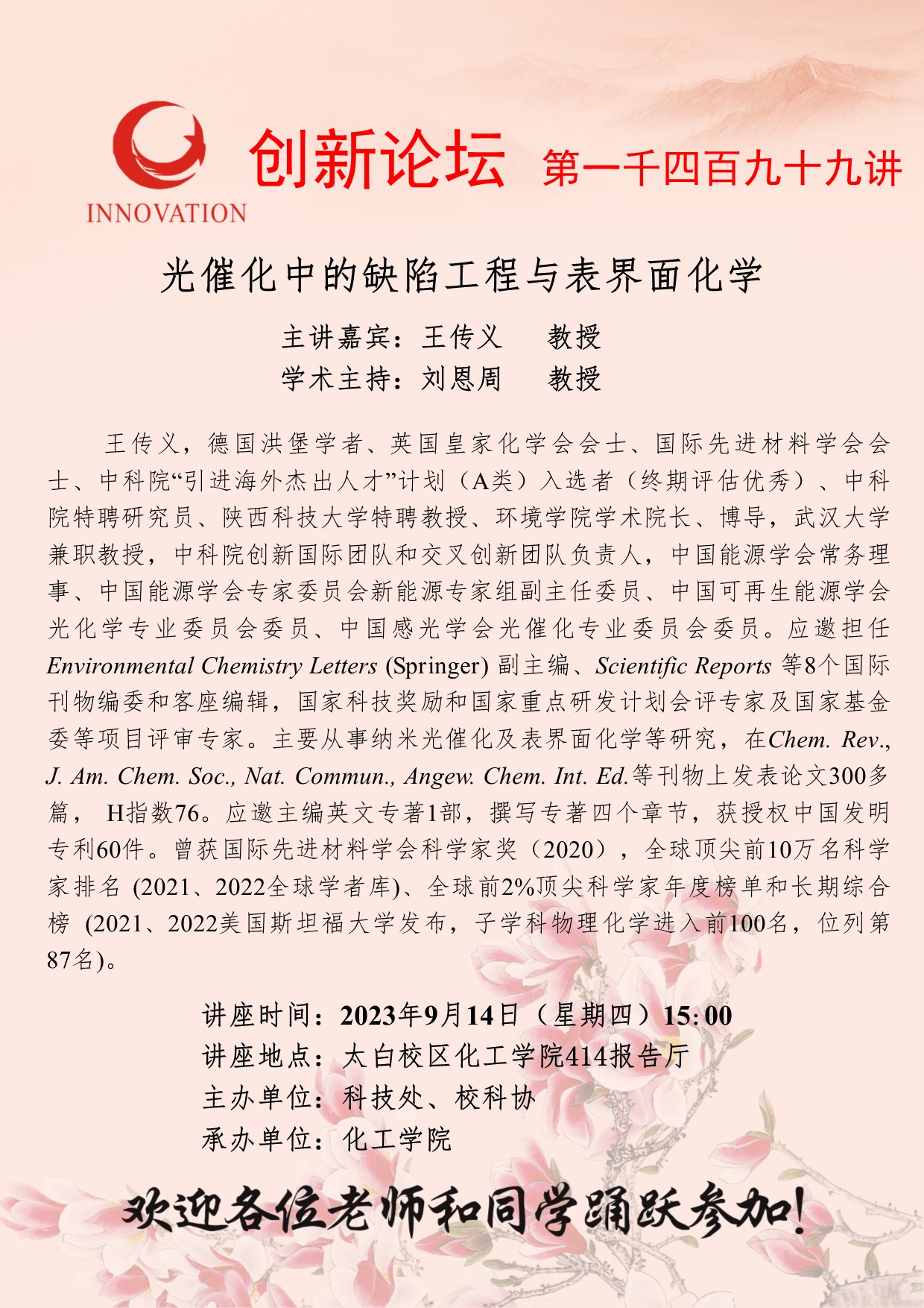 王传义 教授 开云手机网页版登录入口创新论坛第一千四百九十九讲:光催化中的缺陷工程与表界面化学 讲座时间 2023年9月14日(星期四)15:00 讲座地点 太白校区化工学院414报告厅 讲座人介绍 王传义 教授 讲座内容