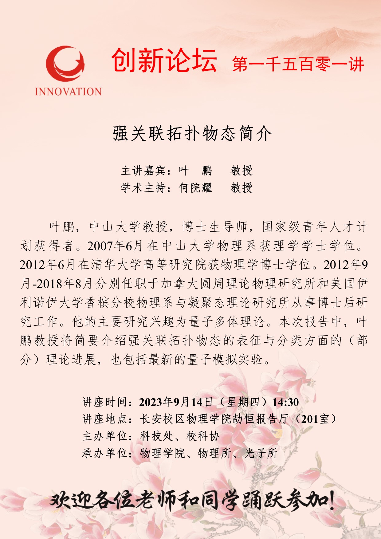 叶鹏 教授 开云手机网页版登录入口创新论坛第一千五百零一讲:强关联拓扑物态简介 讲座时间 2023年9月14日(星期四)14:30 讲座地点 长安校区物理学院劼恒报告厅(201室) 讲座人介绍 叶鹏 教授 讲座内容