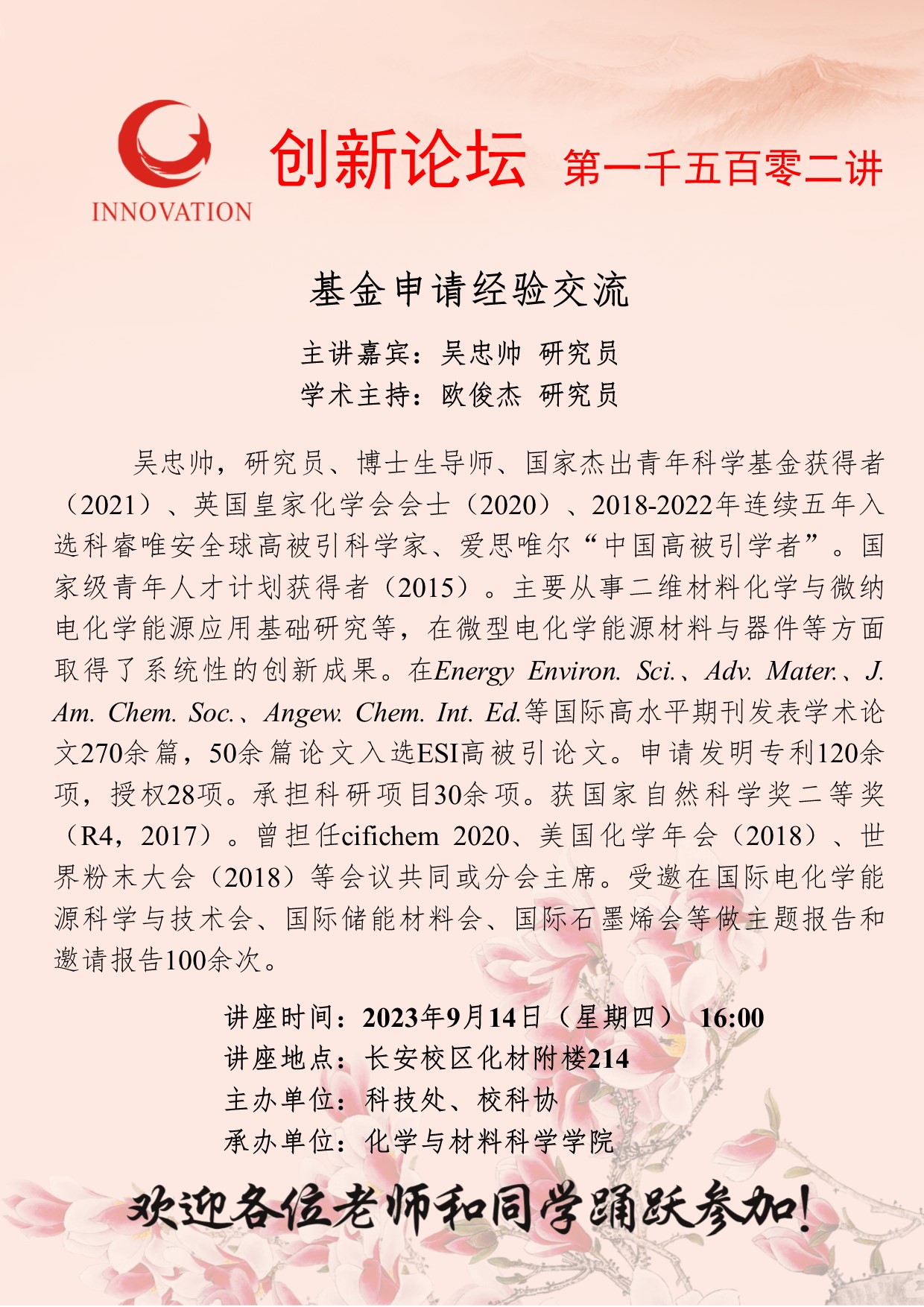 吴忠帅 研究员 开云手机网页版登录入口创新论坛第一千五百零二讲: 基金申请经验交流 讲座时间 2023年9月14日(星期四) 16:00 讲座地点 长安校区化材附楼214 讲座人介绍 吴忠帅 研究员 讲座内容