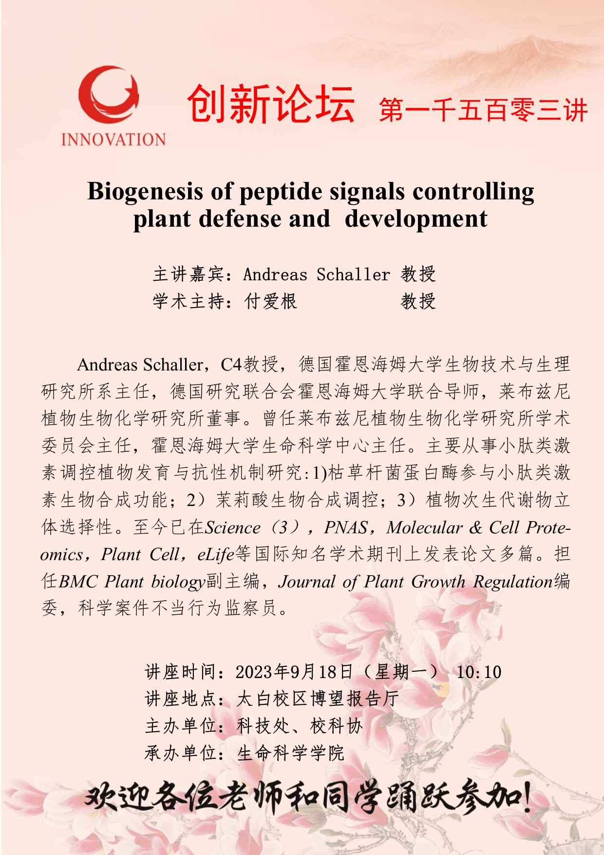 Andreas Schaller 教授 开云手机网页版登录入口创新论坛第一千五百零三讲:Biogenesis of peptide signals controlling plant defense and development 讲座时间 2023年9月18日(星期一) 10:10 讲座地点 太白校区博望报告厅 讲座人介绍 Andreas Schaller 教授 讲座内容
