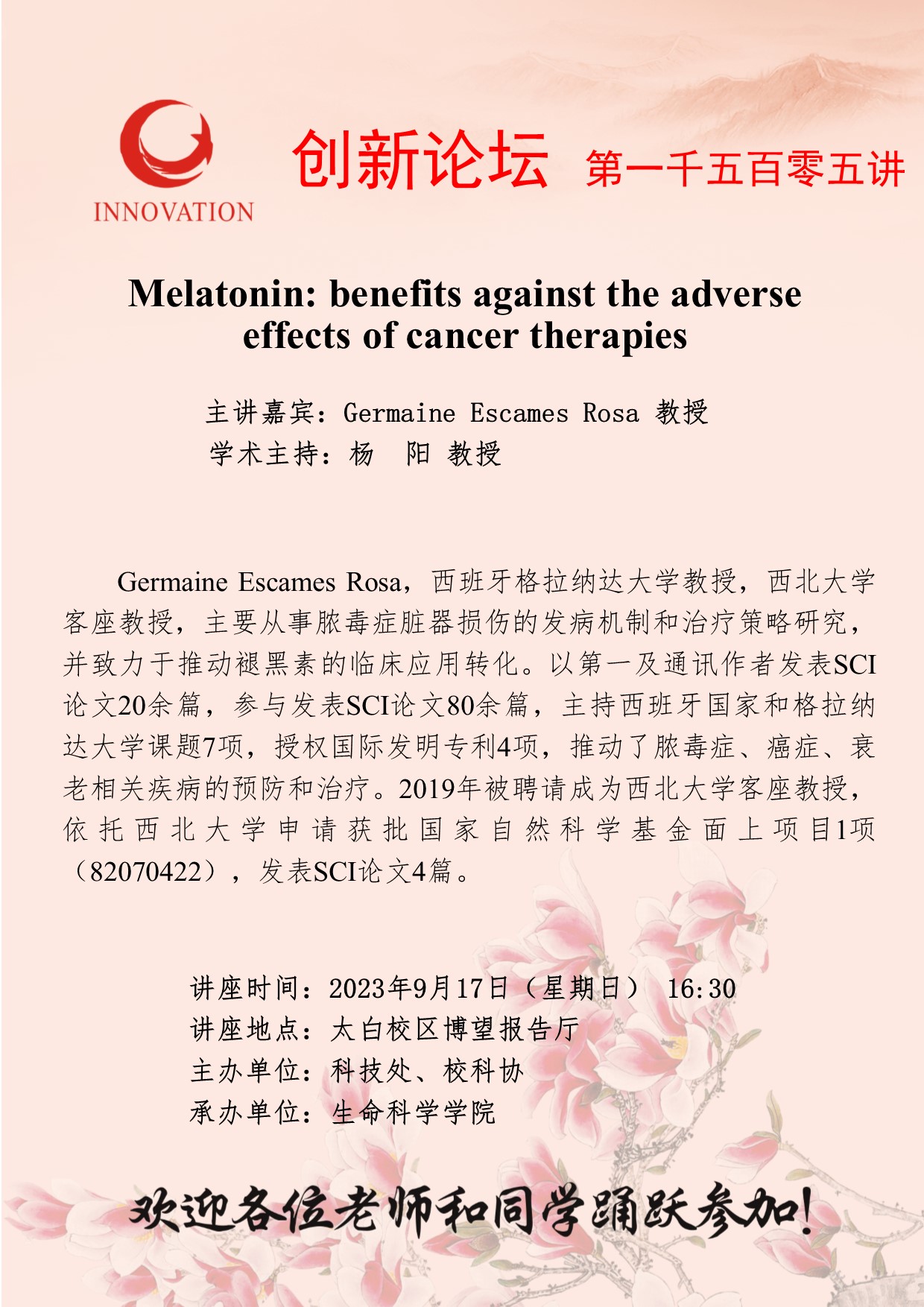 Germaine Escames Rosa 教授 开云手机网页版登录入口创新论坛第一千五百零五讲:Melatonin: benefits against the adverse effects of cancer therapies 讲座时间 2023年9月17日(星期日) 16:30 讲座地点 太白校区博望报告厅 讲座人介绍 Germaine Escames Rosa 教授 讲座内容