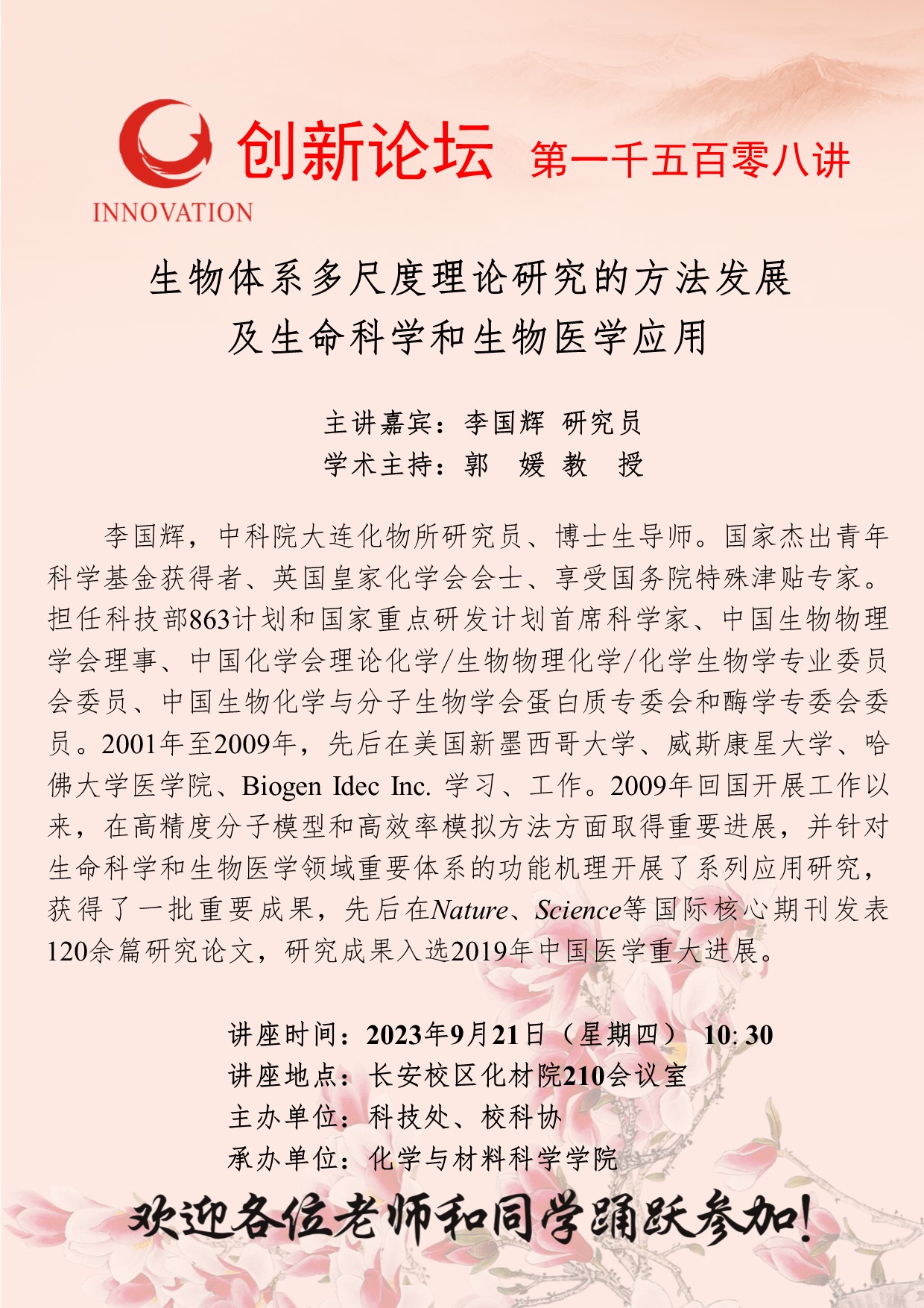 李国辉 研究员 开云手机网页版登录入口创新论坛第一千五百零八讲:生物体系多尺度理论研究的方法发展及生命科学和生物医学应用 讲座时间 2023年9月21日(星期四) 10: 30 讲座地点 长安校区化材院210会议室 讲座人介绍 李国辉 研究员 讲座内容