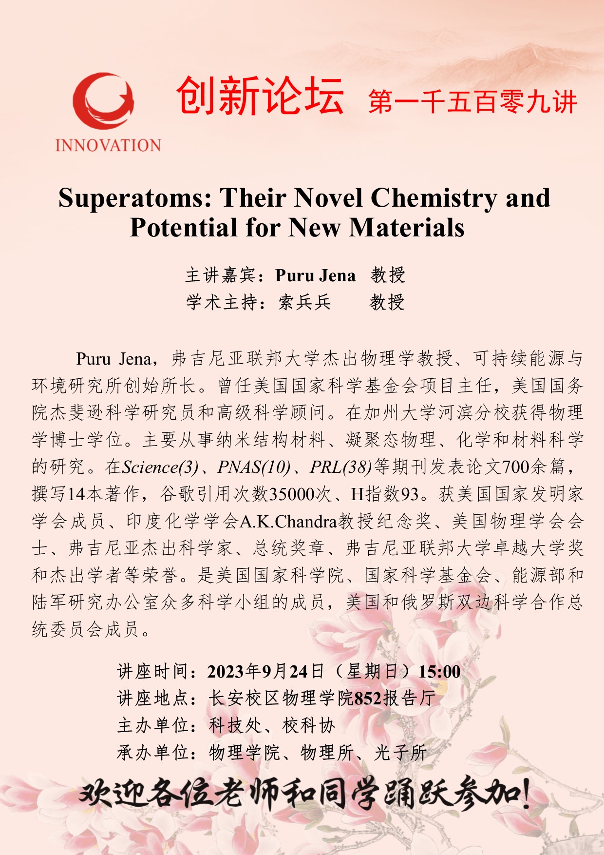 Puru Jena 教授 开云手机网页版登录入口创新论坛第一千五百零九讲:Superatoms: Their Novel Chemistry and Potential for New Materials 讲座时间 2023年9月24日(星期日)15:00 讲座地点 长安校区物理学院852报告厅 讲座人介绍 Puru Jena 教授 讲座内容