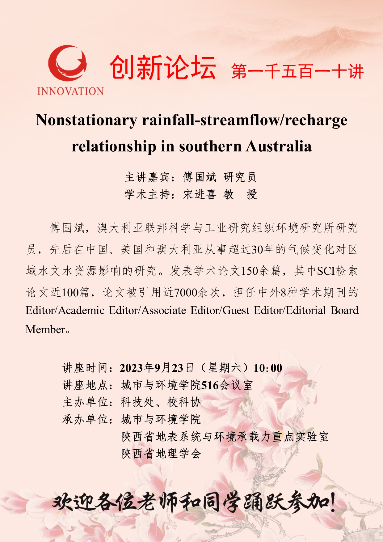 傅国斌 研究员 开云手机网页版登录入口创新论坛第一千五百一十讲:Nonstationary rainfall‐streamflow/recharge relationship in southern Australia 讲座时间 2023年9月23日(星期六)10:00 讲座地点 城市与环境学院516会议室 讲座人介绍 傅国斌 研究员 讲座内容