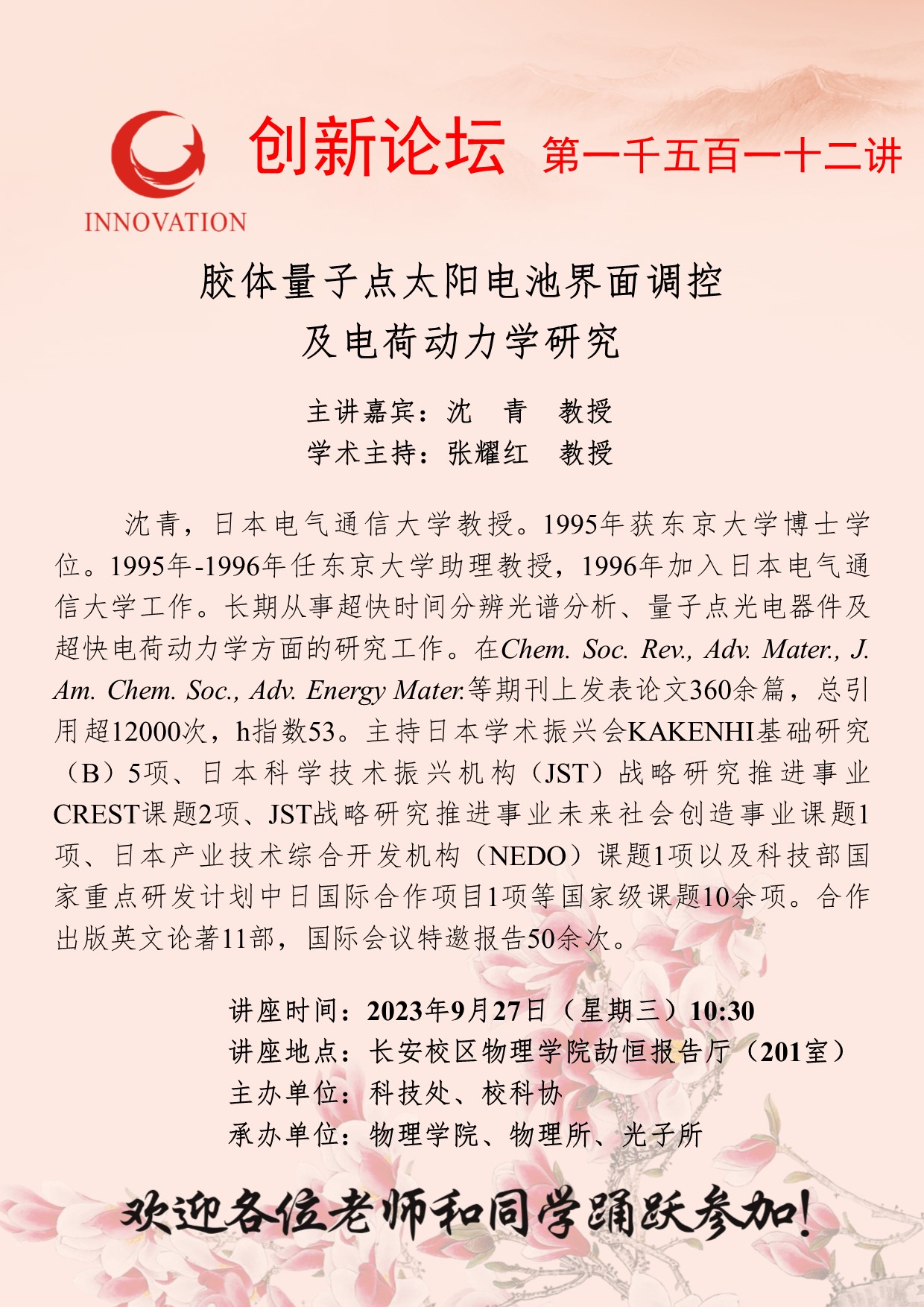 沈青 教授 开云手机网页版登录入口创新论坛第一千五百一十二讲:胶体量子点太阳电池界面调控及电荷动力学研究 讲座时间 2023年9月27日(星期三)10:30 讲座地点 长安校区物理学院劼恒报告厅(201室) 讲座人介绍 沈青 教授 讲座内容
