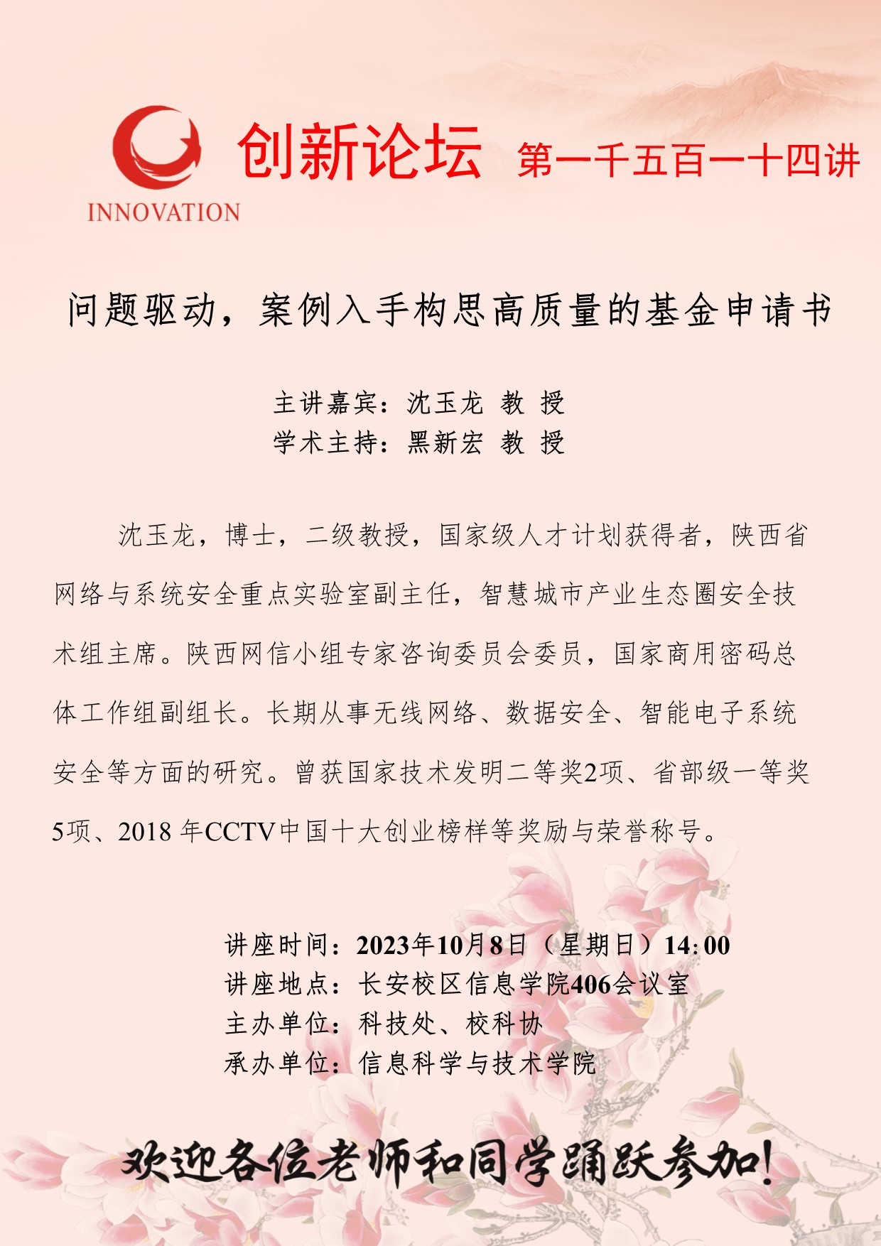 沈玉龙 教 授 开云手机网页版登录入口创新论坛第一千五百一十四讲: 问题驱动,案例入手构思高质量的基金申请书 讲座时间 2023年10月8日(星期日)14:00 讲座地点 长安校区信息学院406会议室 讲座人介绍 沈玉龙 教 授 讲座内容