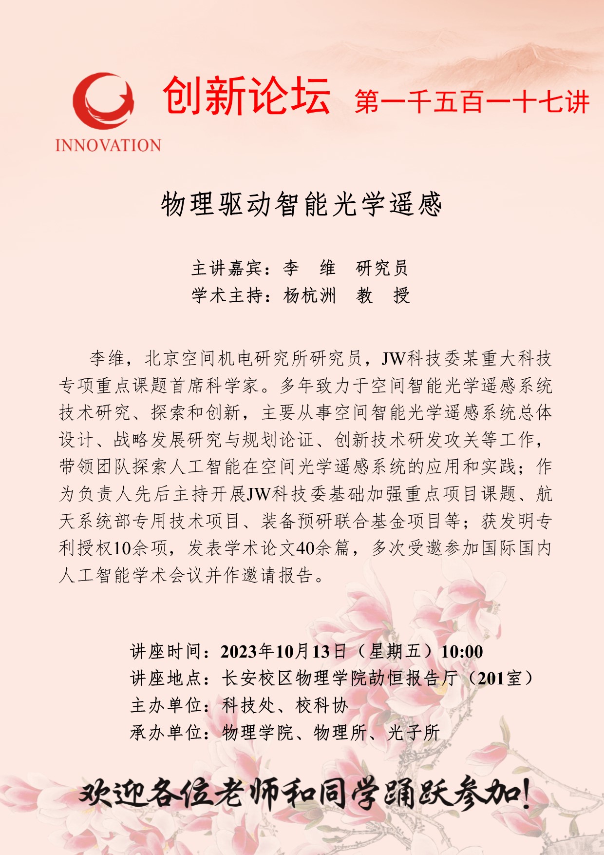 李维 研究员 开云手机网页版登录入口创新论坛第一千五百一十七讲:物理驱动智能光学遥感 讲座时间 2023年10月13日(星期五)10:00 讲座地点 长安校区物理学院劼恒报告厅(201室) 讲座人介绍 李维 研究员 讲座内容