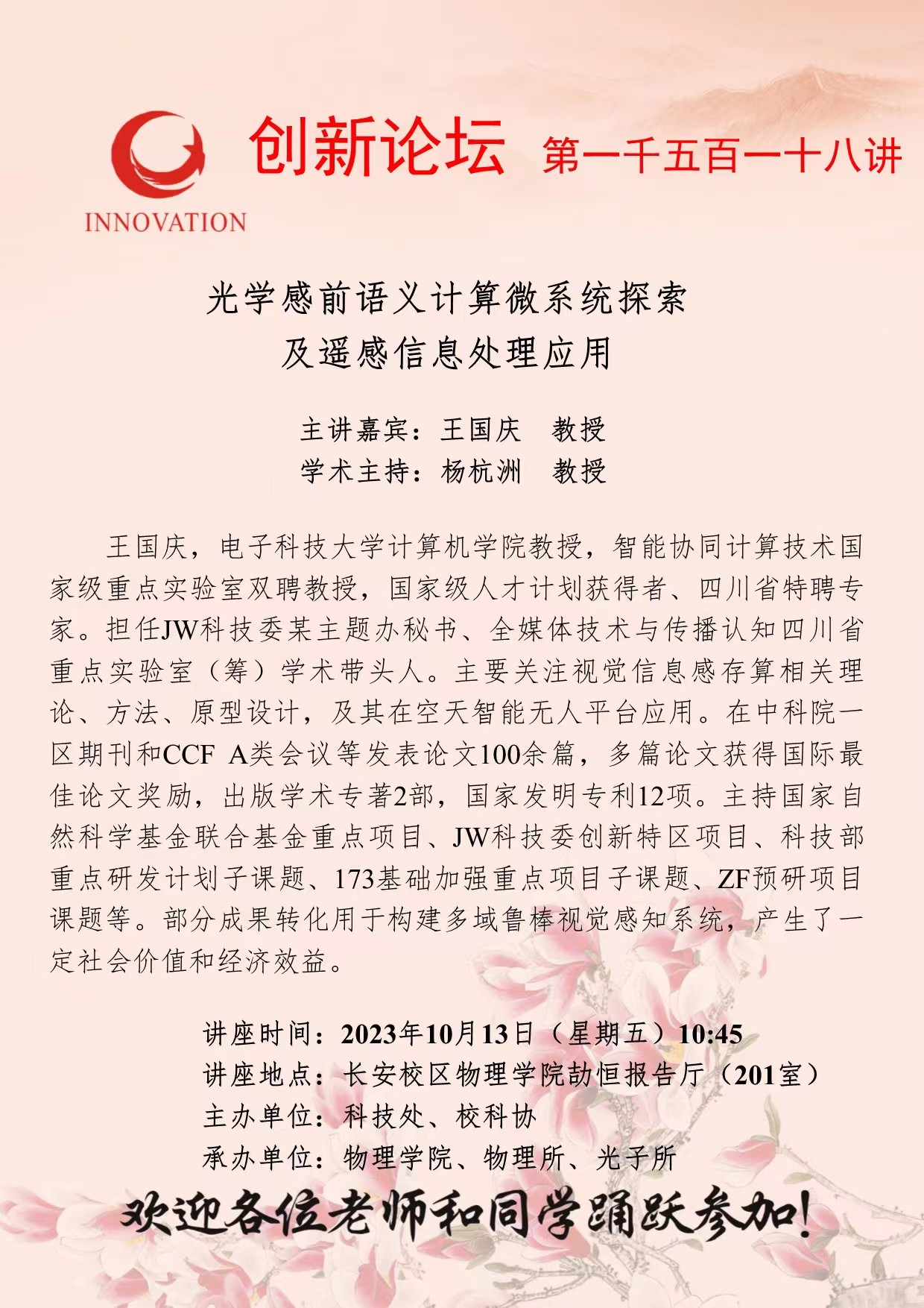 王国庆 教授 开云手机网页版登录入口创新论坛第一千五百一十八讲:光学感前语义计算微系统探索及遥感信息处理应用 讲座时间 2023年10月13日(星期五)10:45 讲座地点 长安校区物理学院劼恒报告厅(201室) 讲座人介绍 王国庆 教授 讲座内容