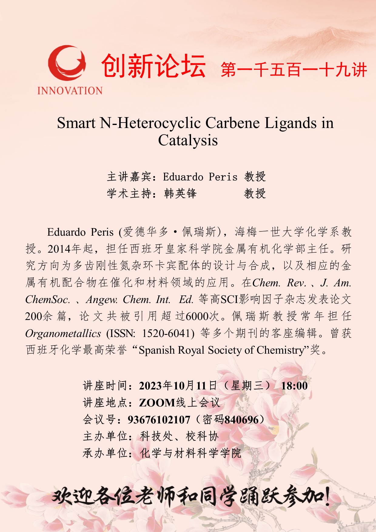 Eduardo Peris 教授 开云手机网页版登录入口创新论坛第一千五百一十九讲: Smart N-Heterocyclic Carbene Ligands in Catalysis 讲座时间 2023年10月11日(星期三) 18:00 讲座地点 ZOOM线上会议 讲座人介绍 Eduardo Peris 教授 讲座内容