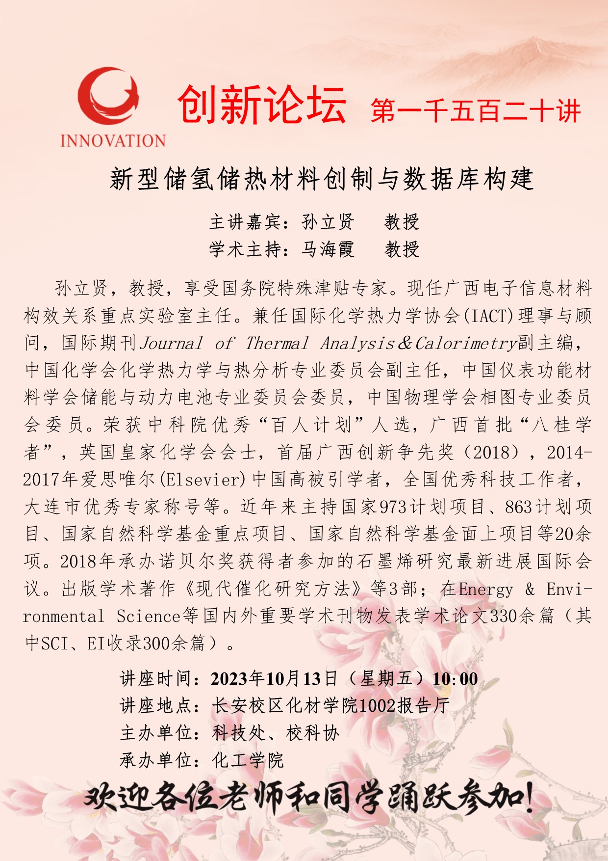 孙立贤 教授 开云手机网页版登录入口创新论坛第一千五百二十讲:新型储氢储热材料创制与数据库构建 讲座时间 2023年10月13日(星期五)10:00 讲座地点 长安校区化材学院1002报告厅 讲座人介绍 孙立贤 教授 讲座内容