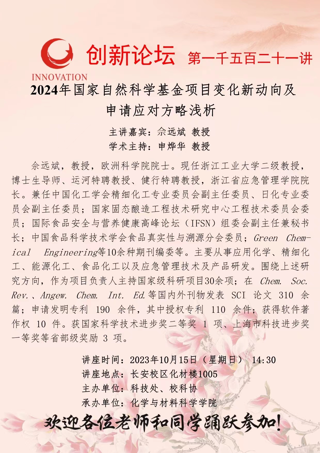 佘远斌 教授 开云手机网页版登录入口创新论坛第一千五百二十一讲: 2024年国家自然科学基金项目变化新动向及申请应对方略浅析 讲座时间 2023年10月15日(星期日) 14:30 讲座地点 长安校区化材楼1005 讲座人介绍 佘远斌 教授 讲座内容