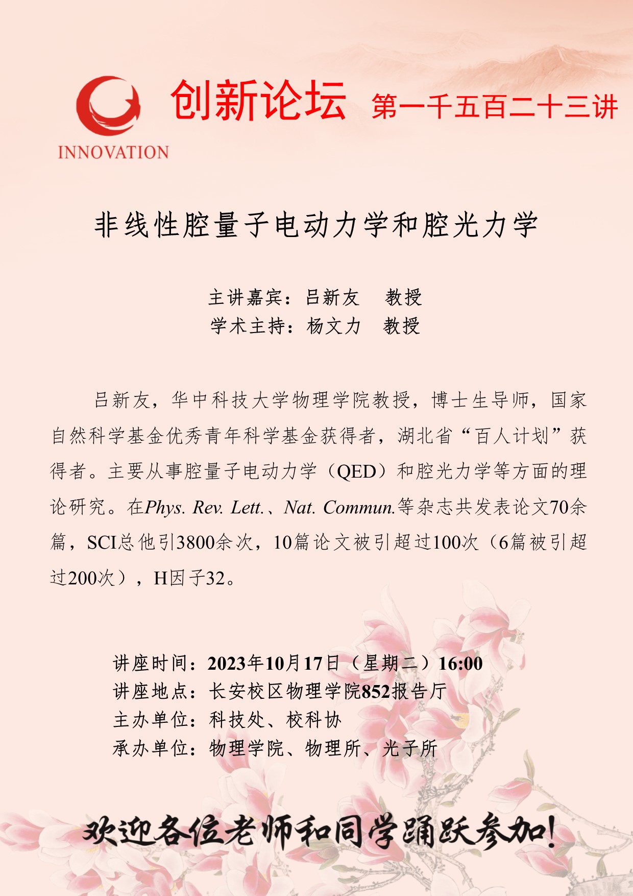 吕新友 教授 开云手机网页版登录入口创新论坛第一千五百二十三讲:非线性腔量子电动力学和腔光力学 讲座时间 2023年10月17日(星期二)16:00 讲座地点 长安校区物理学院852报告厅 讲座人介绍 吕新友 教授 讲座内容