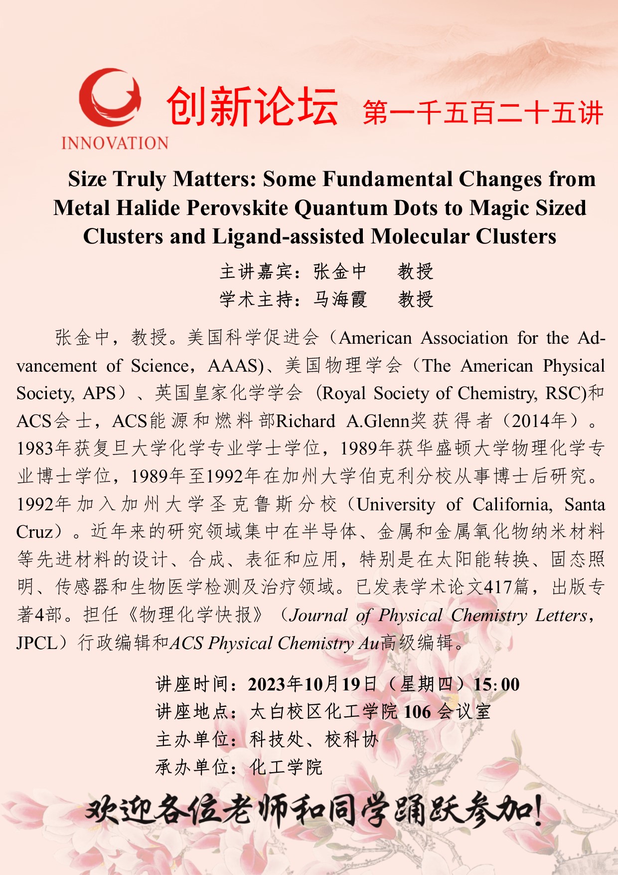 张金中 教授 开云手机网页版登录入口创新论坛第一千五百二十五讲:Size Truly Matters: Some Fundamental Changes from Metal Halide Perovskite Quantum Dots to Magic Sized Clusters and Ligand-assisted Molecular Clusters 讲座时间 2023年10月19日(星期四)15:00 讲座地点 太白校区化工学院106会议室 讲座人介绍 张金中 教授 讲座内容