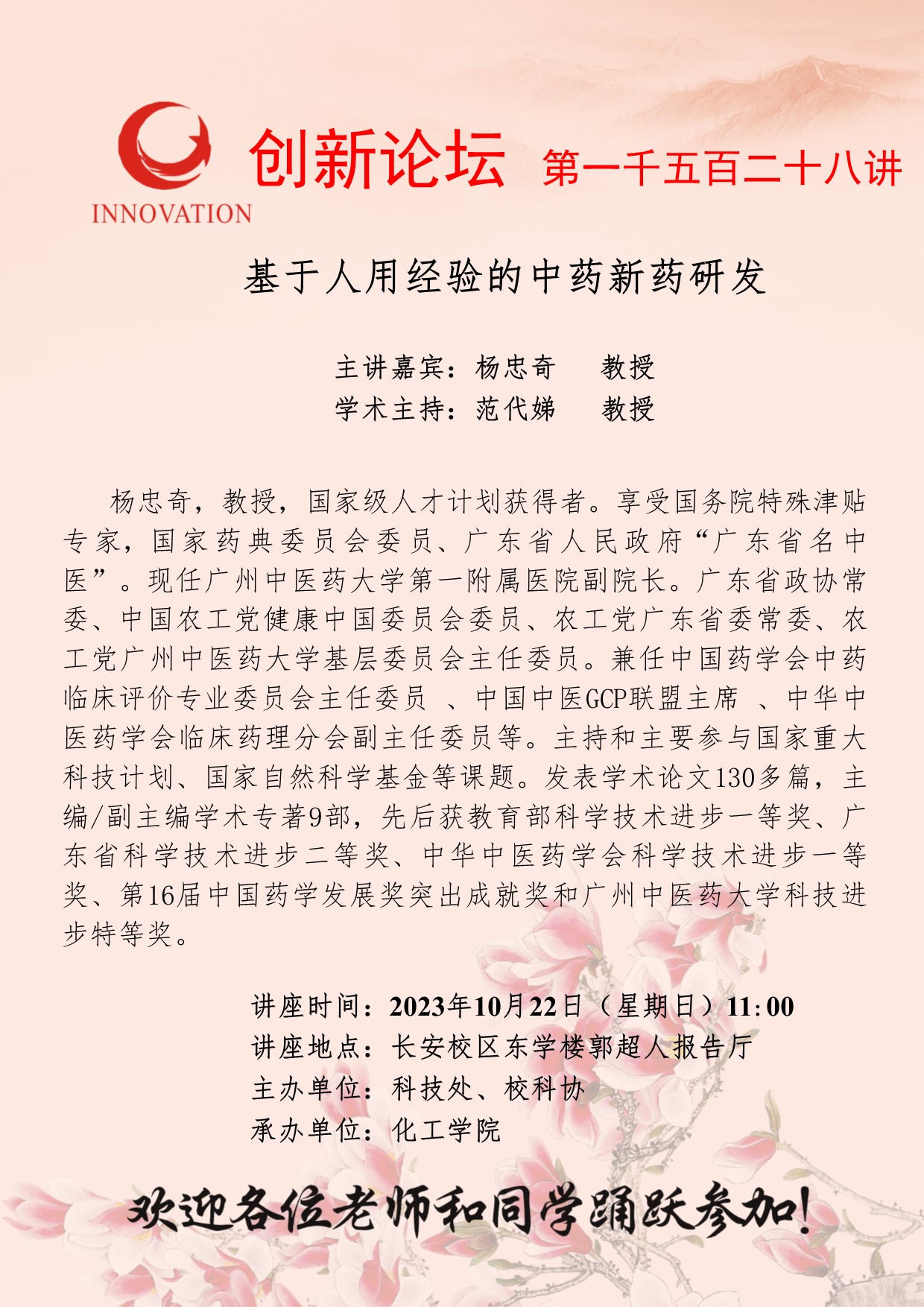 杨忠奇 教授 开云手机网页版登录入口创新论坛第一千五百二十八讲:基于人用经验的中药新药研发 讲座时间 2023年10月22日(星期日)11:00 讲座地点 长安校区东学楼郭超人报告厅 讲座人介绍 杨忠奇 教授 讲座内容