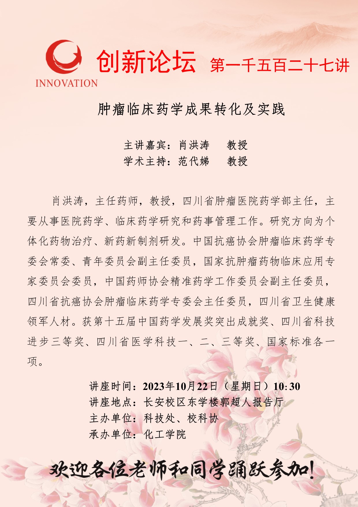 肖洪涛 教授 开云手机网页版登录入口创新论坛第一千五百二十七讲:肿瘤临床药学成果转化及实践 讲座时间 2023年10月22日(星期日)10:30 讲座地点 长安校区东学楼郭超人报告厅 讲座人介绍 肖洪涛 教授 讲座内容