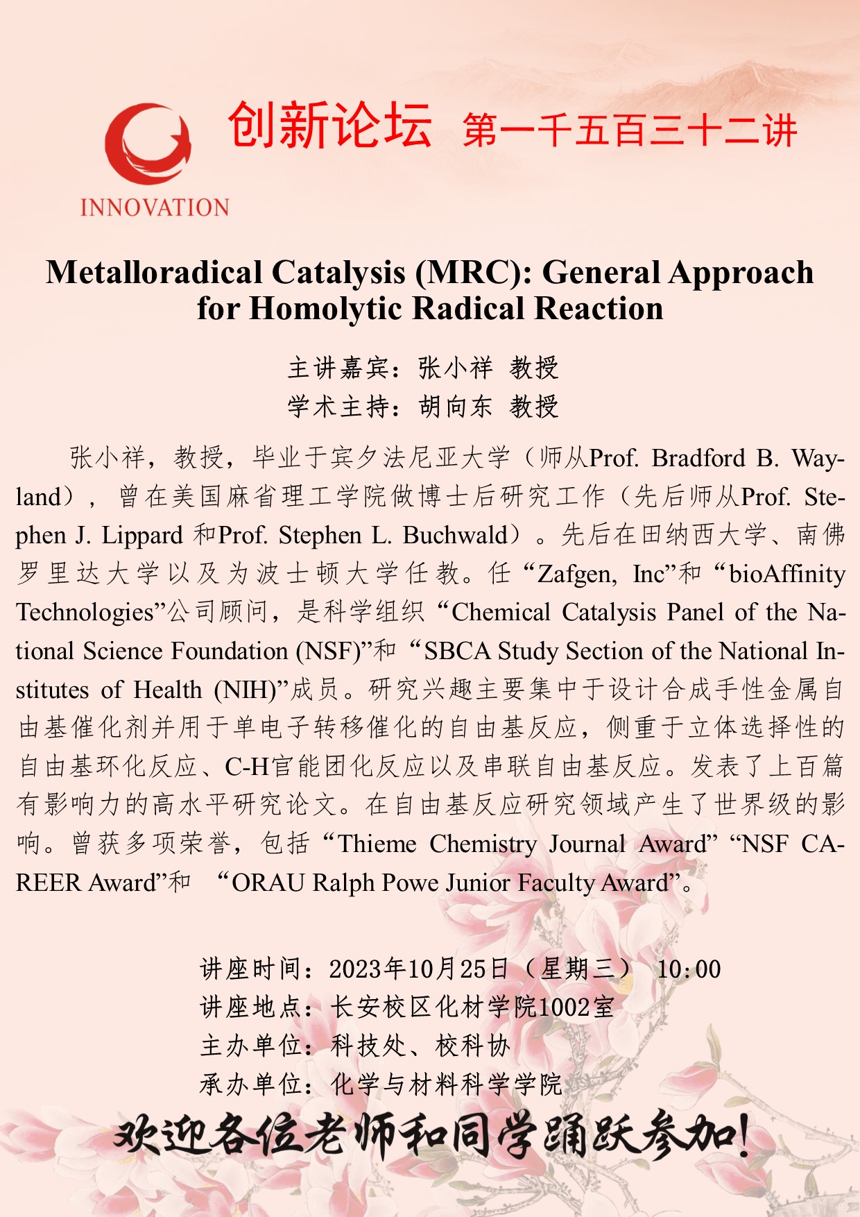 张小祥 教授 开云手机网页版登录入口创新论坛第一千五百三十二讲:Metalloradical Catalysis (MRC): General Approach for Homolytic Radical Reaction 讲座时间 2023年10月25日(星期三) 10:00 讲座地点 长安校区化材学院1002室 讲座人介绍 张小祥 教授 讲座内容
