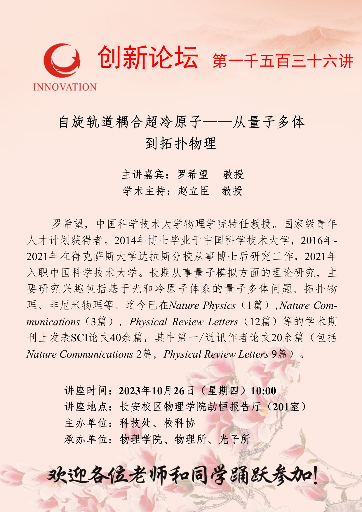 罗希望 教授 开云手机网页版登录入口创新论坛第一千五百三十六讲:自旋轨道耦合超冷原子——从量子多体到拓扑物理 讲座时间 2023年10月26日(星期四)10:00 讲座地点 长安校区物理学院劼恒报告厅(201室) 讲座人介绍 罗希望 教授 讲座内容