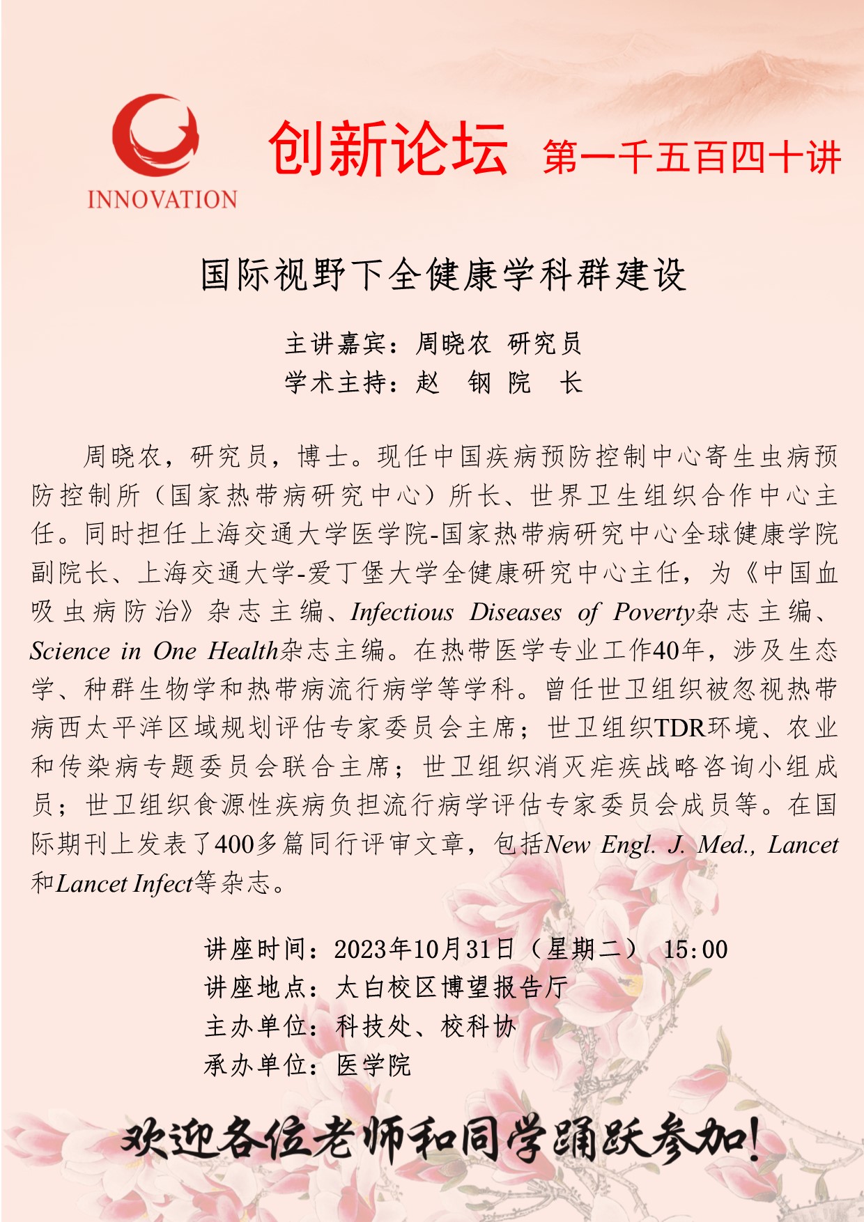 周晓农 研究员 开云手机网页版登录入口创新论坛第一千五百四十讲:国际视野下全健康学科群建设 讲座时间 2023年10月31日(星期二) 15:00 讲座地点 太白校区博望报告厅 讲座人介绍 周晓农 研究员 讲座内容