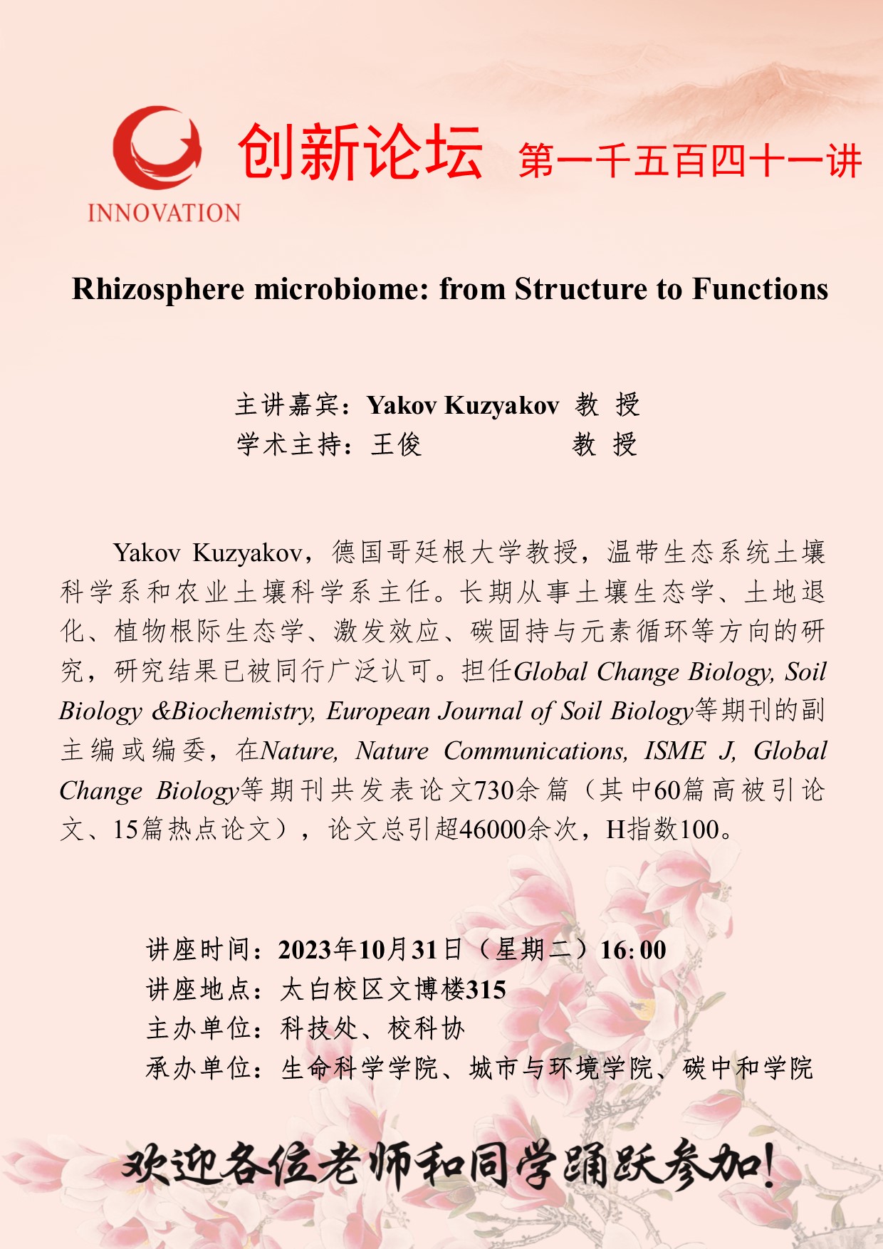 Yakov Kuzyakov 教 授 开云手机网页版登录入口创新论坛第一千五百四十一讲:Rhizosphere microbiome: from Structure to Functions 讲座时间 2023年10月31日(星期二)16:00 讲座地点 太白校区文博楼315 讲座人介绍 Yakov Kuzyakov 教 授 讲座内容