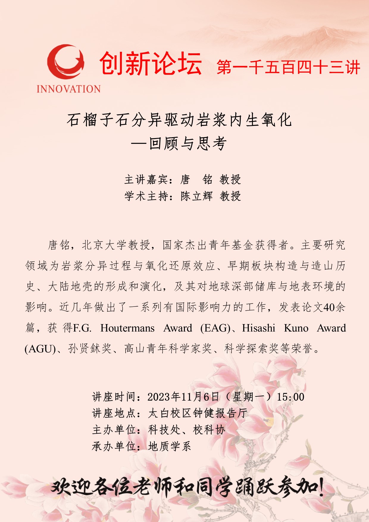唐铭 教授 开云手机网页版登录入口创新论坛第一千五百四十三讲:石榴子石分异驱动岩浆内生氧化—回顾与思考 讲座时间 2023年11月6日(星期一)15:00 讲座地点 太白校区钟健报告厅 讲座人介绍 唐铭 教授 讲座内容
