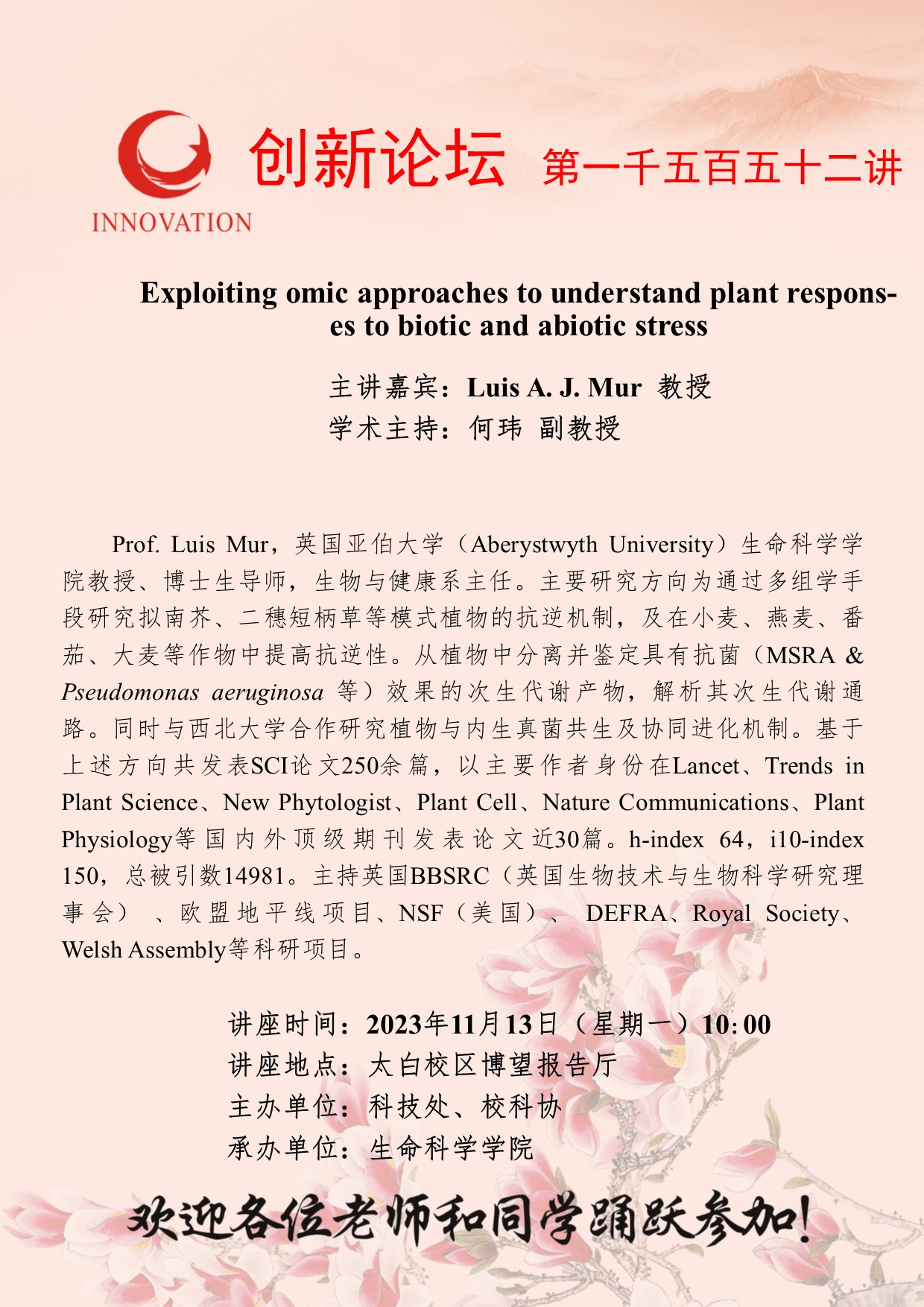 Luis A. J. Mur 教授 开云手机网页版登录入口创新论坛第一千五百五十二讲:Exploiting omic approaches to understand plant responses to biotic and abiotic stress 讲座时间 2023年11月13日(星期一)10:00 讲座地点 太白校区博望报告厅 讲座人介绍 Luis A. J. Mur 教授 讲座内容