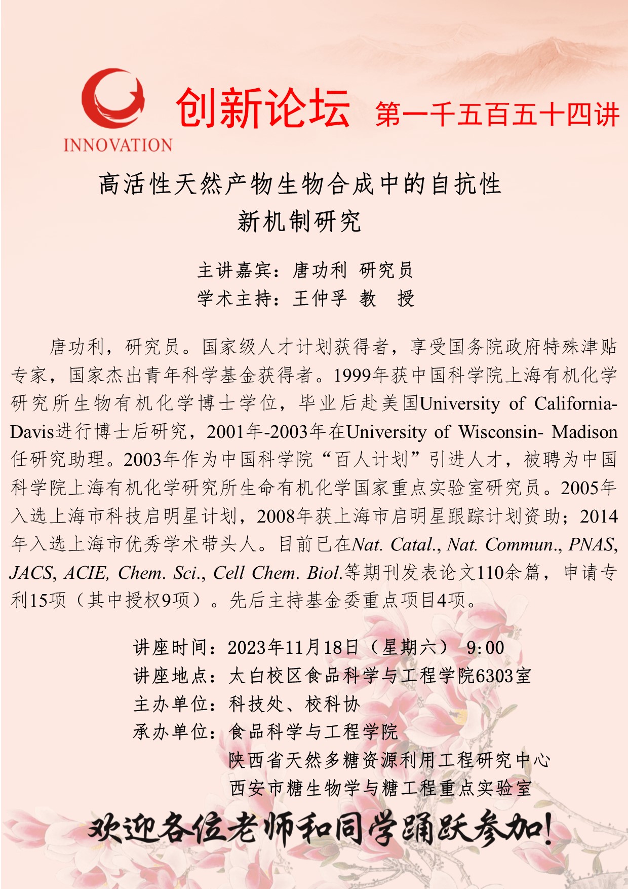 唐功利 研究员 开云手机网页版登录入口创新论坛第一千五百五十四讲:高活性天然产物生物合成中的自抗性 新机制研究 讲座时间 2023年11月18日(星期六) 9:00 讲座地点 太白校区食品科学与工程学院6303室 讲座人介绍 唐功利 研究员 讲座内容