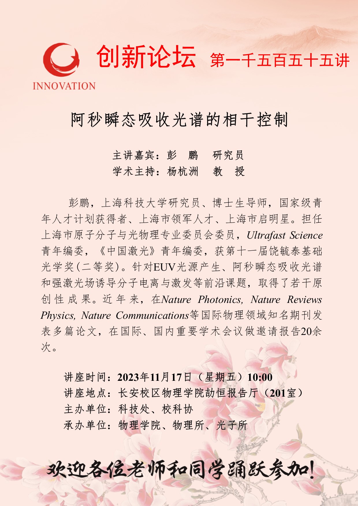 彭鹏 研究员 开云手机网页版登录入口创新论坛第一千五百五十五讲:阿秒瞬态吸收光谱的相干控制 讲座时间 2023年11月17日(星期五)10:00 讲座地点 长安校区物理学院劼恒报告厅(201室) 讲座人介绍 彭鹏 研究员 讲座内容