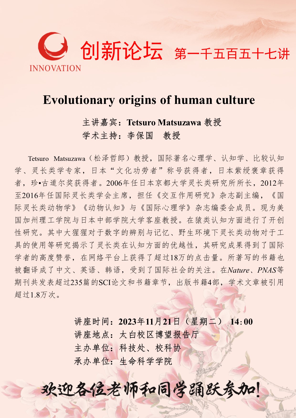Tetsuro Matsuzawa 教授 开云手机网页版登录入口创新论坛第一千五百五十七讲:Evolutionary origins of human culture 讲座时间 2023年11月21日(星期二) 14:00 讲座地点 太白校区博望报告厅 讲座人介绍 Tetsuro Matsuzawa 教授 讲座内容