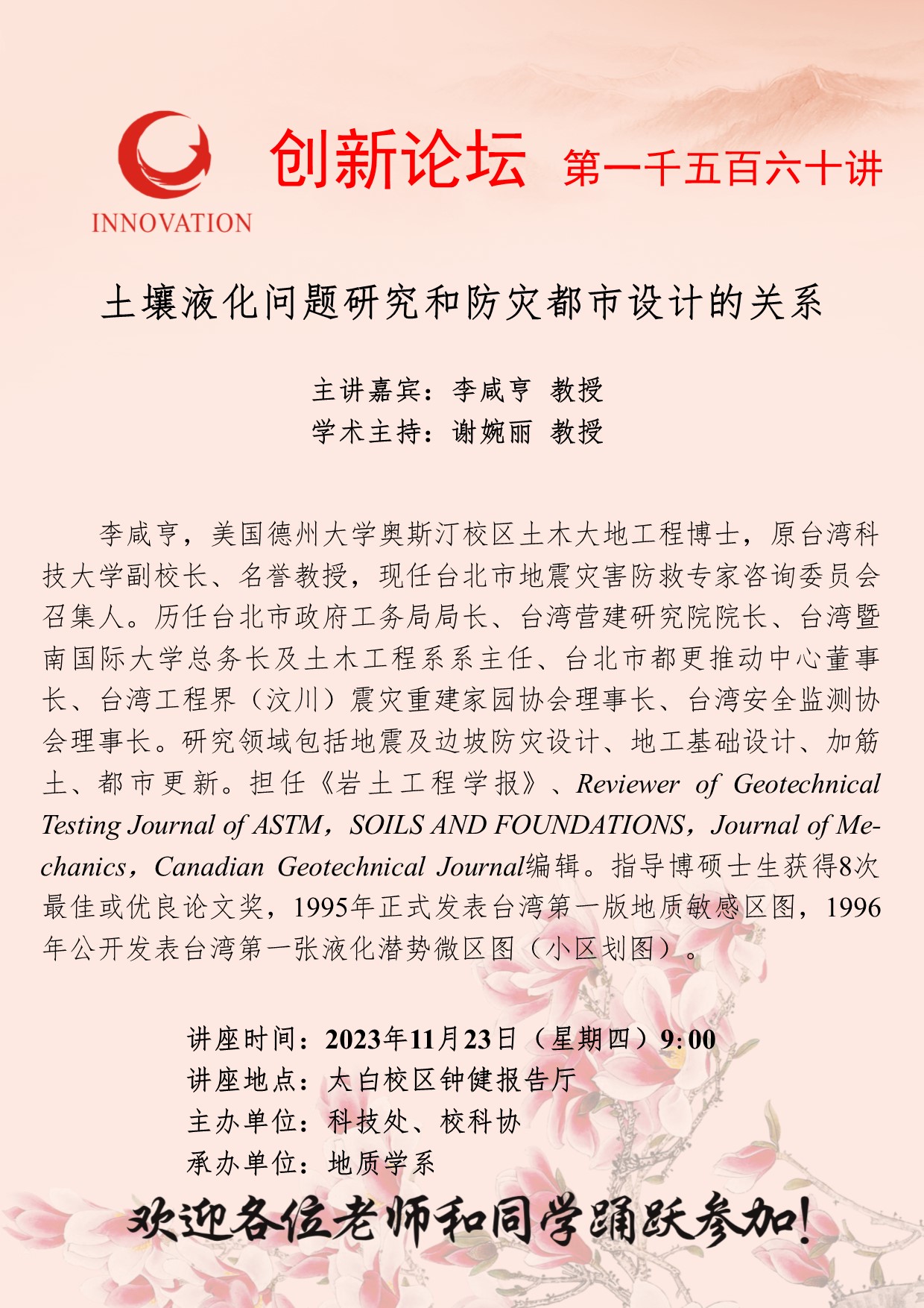 李咸亨 教授 开云手机网页版登录入口创新论坛第一千五百六十讲:土壤液化问题研究和防灾都市设计的关系 讲座时间 2023年11月23日(星期四)9:00 讲座地点 太白校区钟健报告厅 讲座人介绍 李咸亨 教授 讲座内容