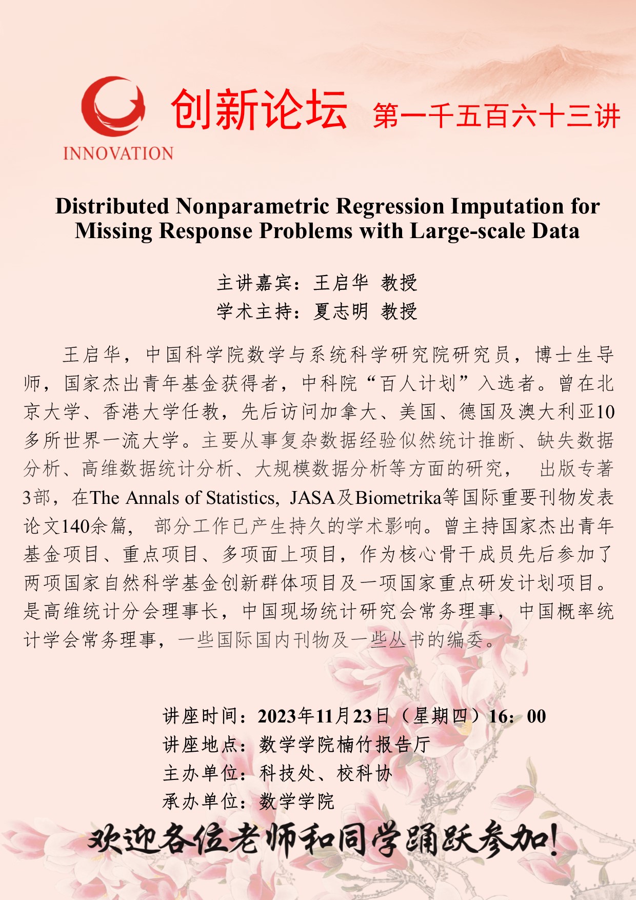 王启华 教授 开云手机网页版登录入口创新论坛第一千五百六十三讲:Distributed Nonparametric Regression Imputation for Missing Response Problems with Large-scale Data 讲座时间 2023年11月23日(周四)16:00 讲座地点 数学学院楠竹报告厅 讲座人介绍 王启华 教授 讲座内容