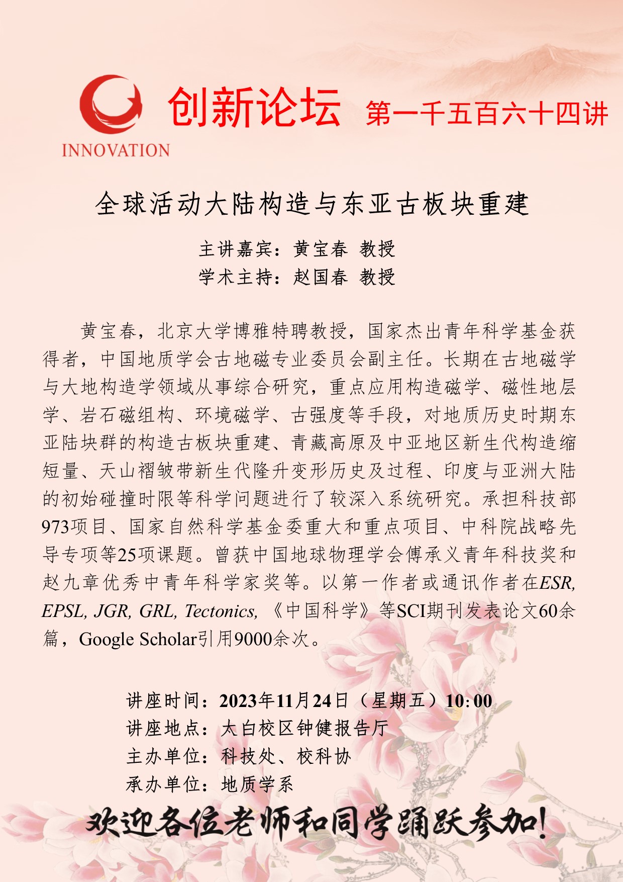 黄宝春 教授 开云手机网页版登录入口创新论坛第一千五百六十四讲:全球活动大陆构造与东亚古板块重建 讲座时间 2023年11月24日(星期五)10:00 讲座地点 太白校区钟健报告厅 讲座人介绍 黄宝春 教授 讲座内容