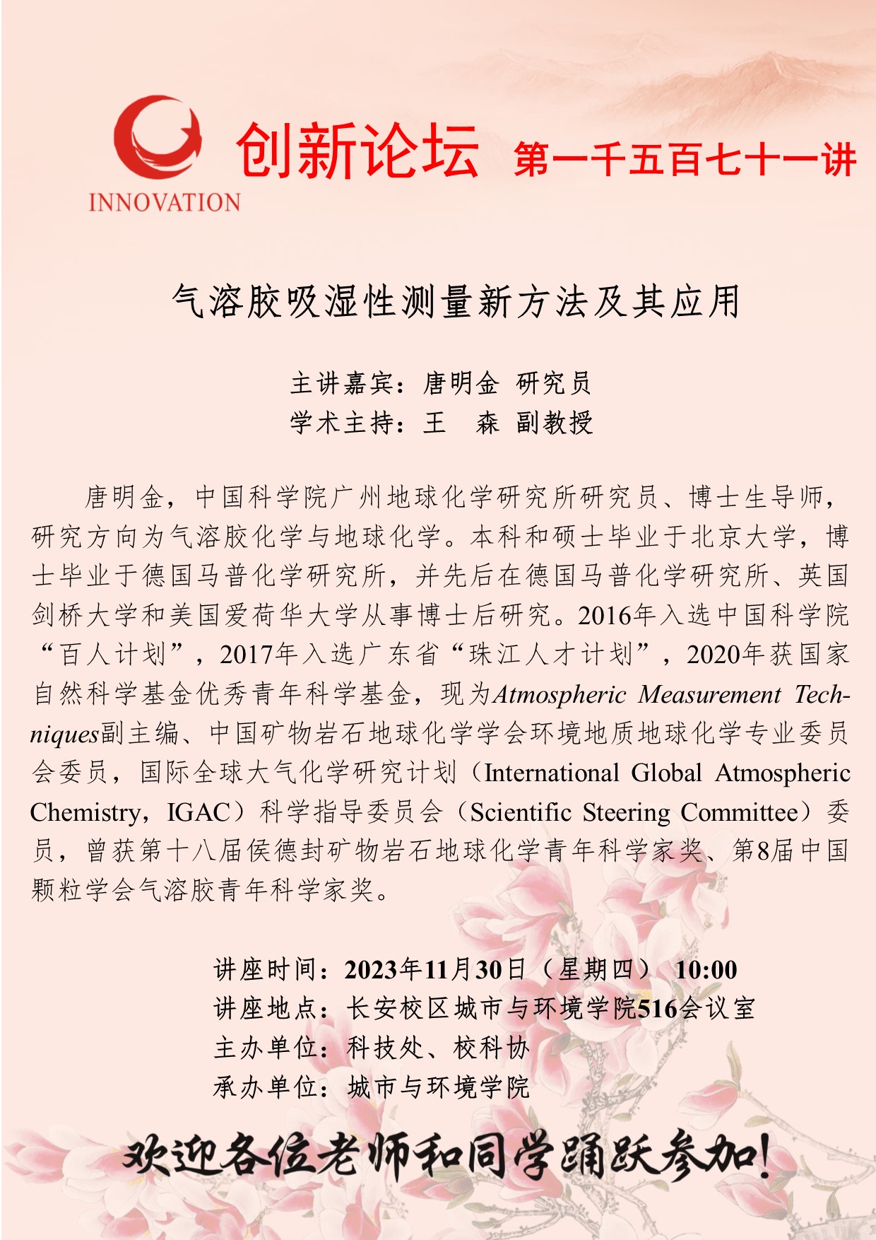唐明金 研究员 开云手机网页版登录入口创新论坛第一千五百七十一讲:气溶胶吸湿性测量新方法及其应用 讲座时间 2023年11月30日(星期四) 10:00 讲座地点 长安校区城市与环境学院516会议室 讲座人介绍 唐明金 研究员 讲座内容