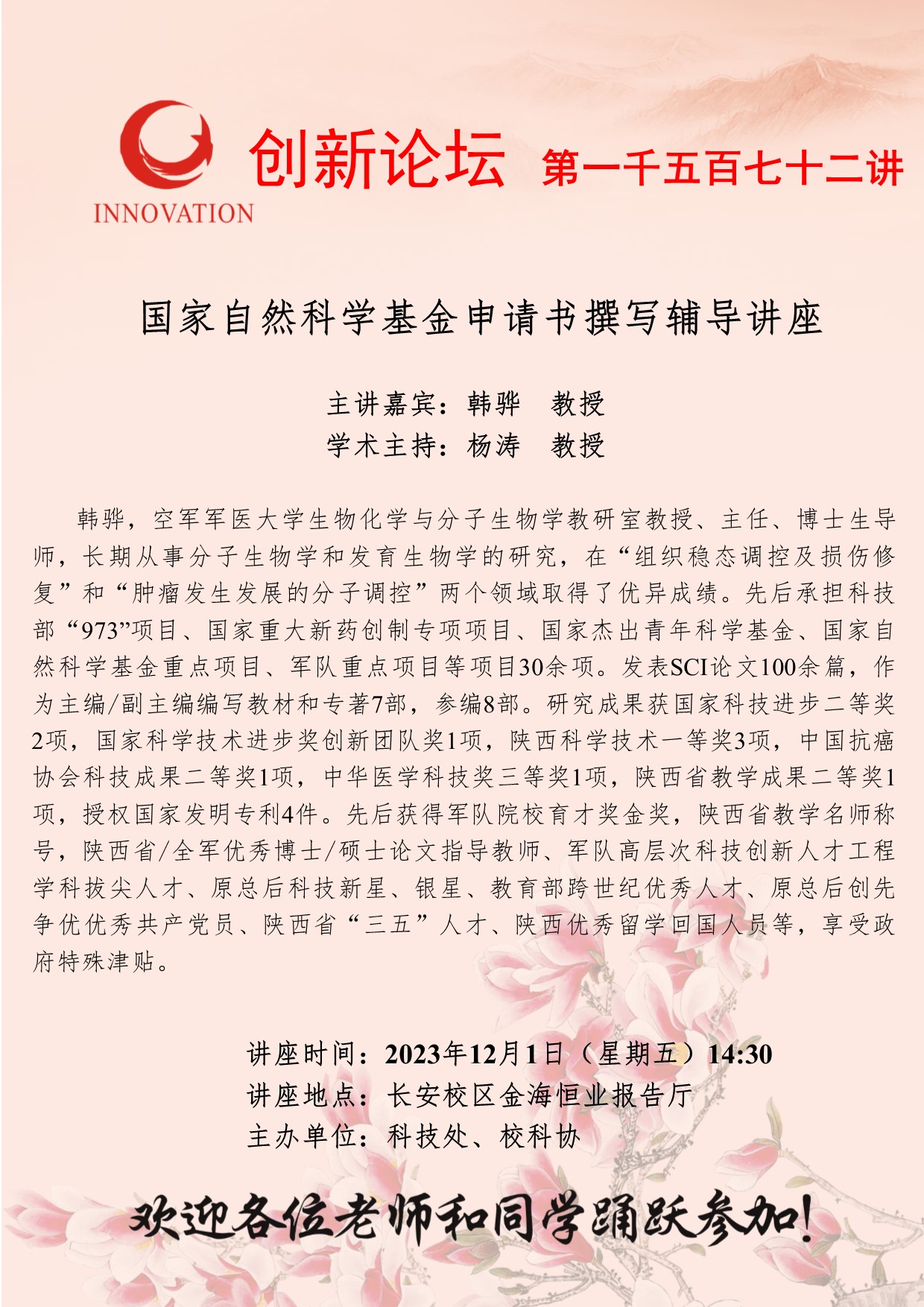 韩骅 教授 开云手机网页版登录入口创新论坛第一千五百七十二讲:国家自然科学基金申请书撰写辅导讲座 讲座时间 2023年12月1日(星期五)14:30 讲座地点 长安校区金海恒业报告厅 讲座人介绍 韩骅 教授 讲座内容