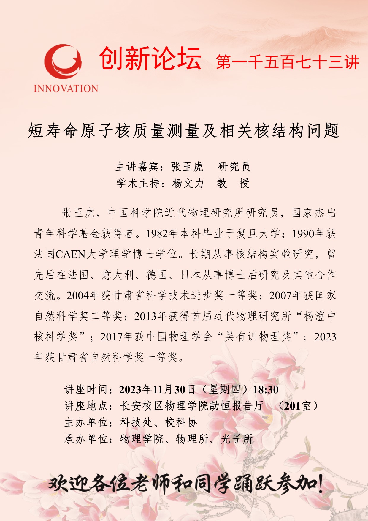 张玉虎 研究员 开云手机网页版登录入口创新论坛第一千五百七十三讲:短寿命原子核质量测量及相关核结构问题 讲座时间 2023年11月30日(星期四)18:30 讲座地点 长安校区物理学院劼恒报告厅 (201室) 讲座人介绍 张玉虎 研究员 讲座内容
