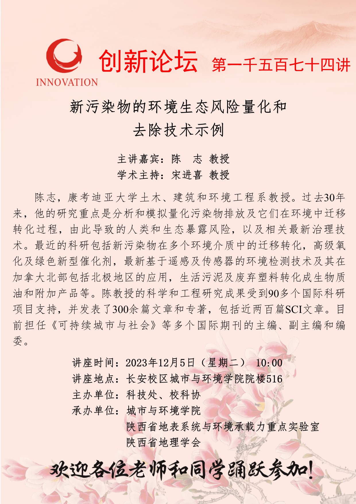 陈志 教授 开云手机网页版登录入口创新论坛第一千五百七十四讲:新污染物的环境生态风险量化和去除技术示例 讲座时间 2023年12月5日(星期二) 10:00 讲座地点 长安校区城市与环境学院院楼516 讲座人介绍 陈志 教授 讲座内容