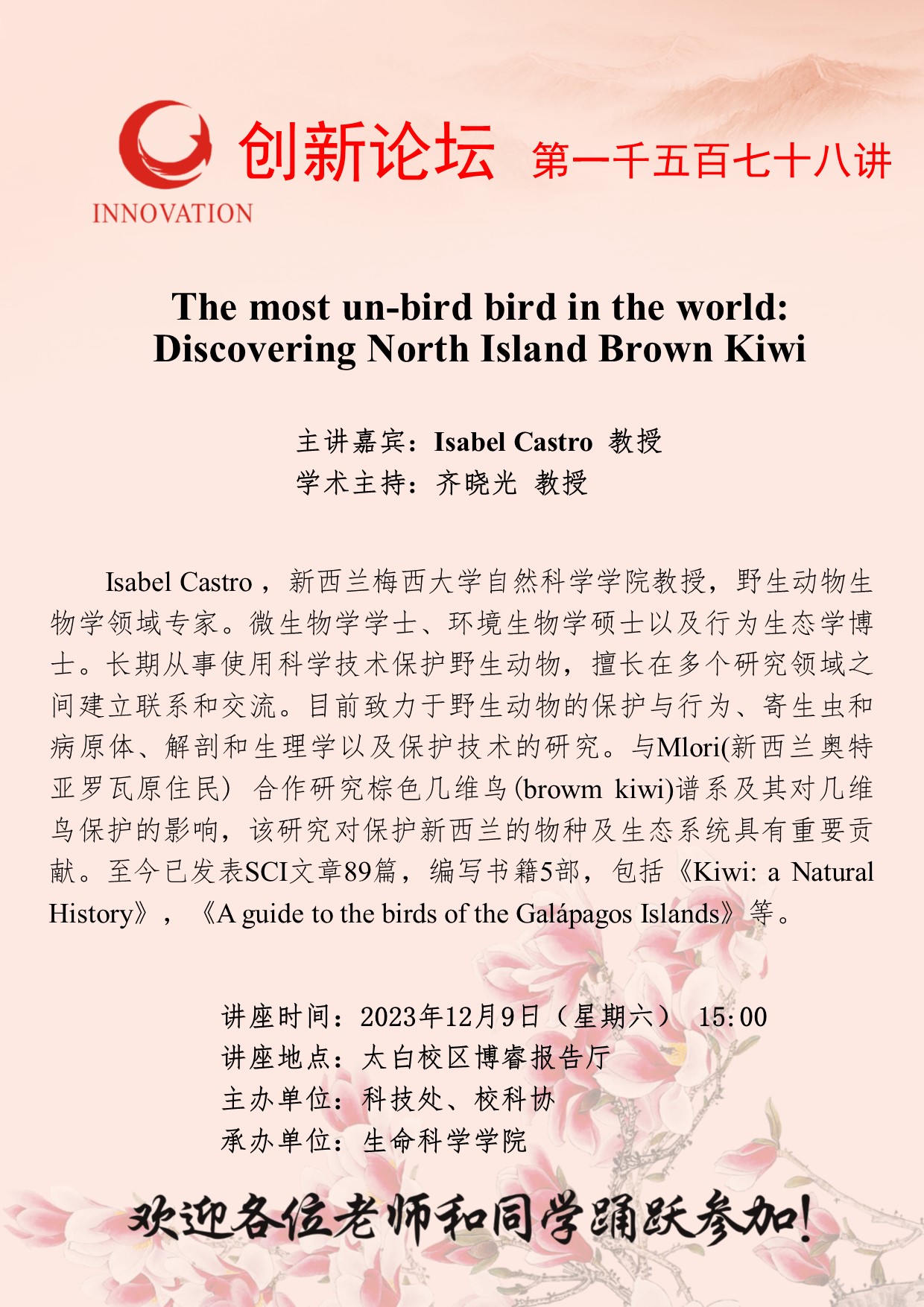 Isabel Castro 教授 开云手机网页版登录入口创新论坛第一千五百七十八讲:The most un-bird bird in the world: Discovering North Island Brown Kiwi 讲座时间 2023年12月9日(星期六) 15:00 讲座地点 太白校区博睿报告厅 讲座人介绍 Isabel Castro 教授 讲座内容