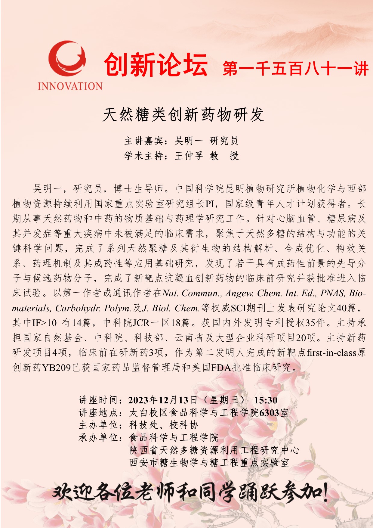 吴明一 研究员 开云手机网页版登录入口创新论坛第一千五百八十一讲:天然糖类创新药物研发 讲座时间 2023年12月13日(星期三) 15:30 讲座地点 太白校区食品科学与工程学院6303室 讲座人介绍 吴明一 研究员 讲座内容