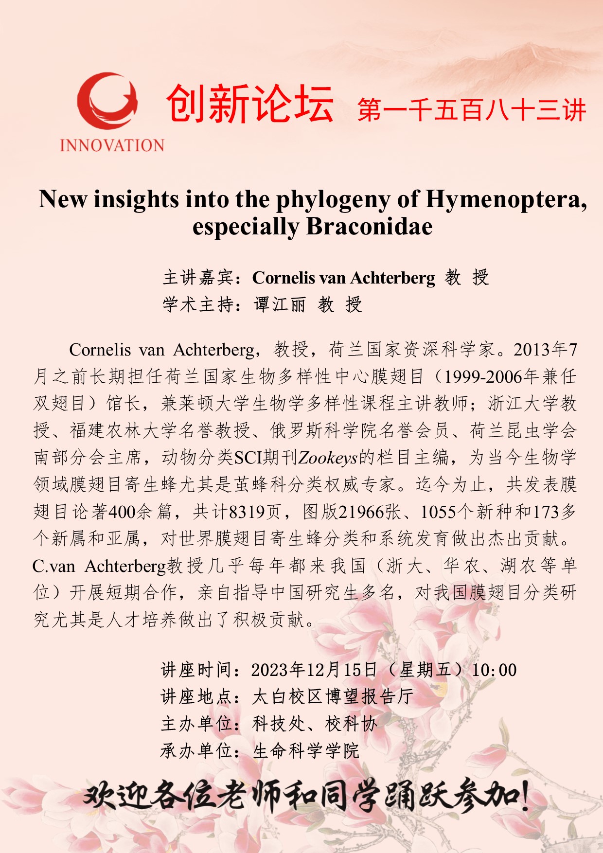 Cornelis van Achterberg 教 授 开云手机网页版登录入口创新论坛第一千五百八十三讲:New insights into the phylogeny of Hymenoptera, especially Braconidae 讲座时间 2023年12月15日(星期五)10:00 讲座地点 太白校区博望报告厅 讲座人介绍 Cornelis van Achterberg 教 授 讲座内容