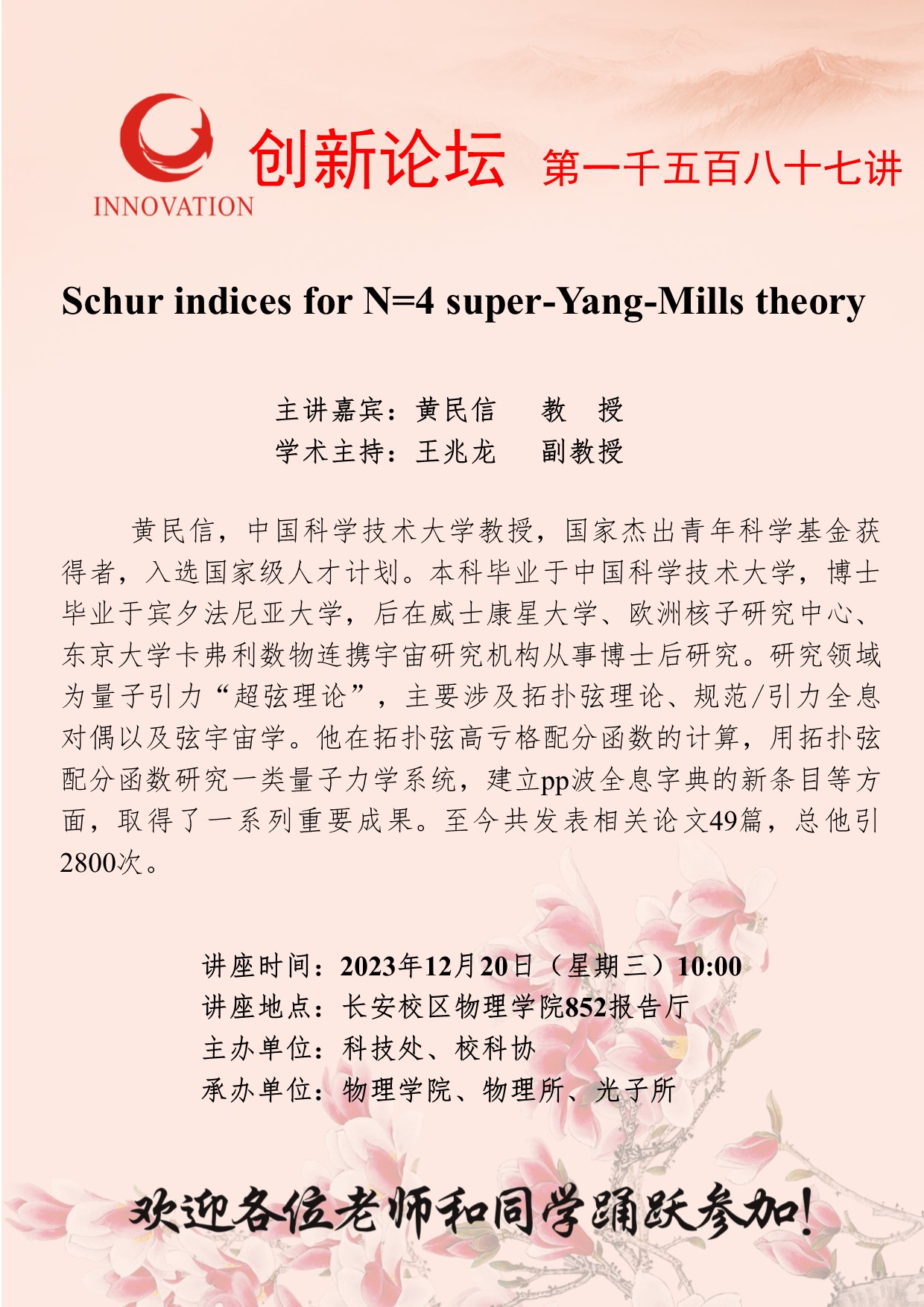 黄民信 教 授 开云手机网页版登录入口创新论坛第一千五百八十七讲:Schur indices for N=4 super-Yang-Mills theory 讲座时间 2023年12月20日(星期三)10:00 讲座地点 长安校区物理学院852报告厅 讲座人介绍 黄民信 教 授 讲座内容
