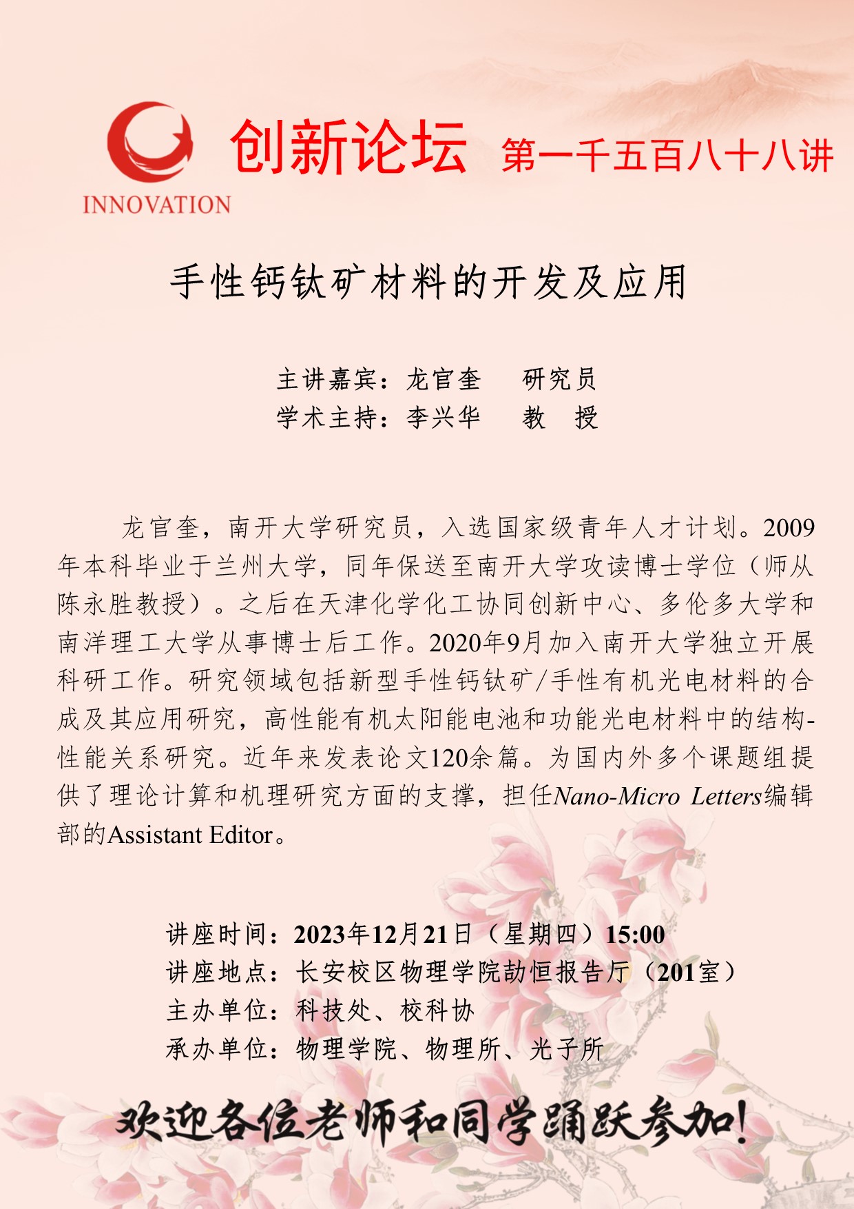 龙官奎 研究员 开云手机网页版登录入口创新论坛第一千五百八十八讲:手性钙钛矿材料的开发及应用 讲座时间 2023年12月21日(星期四)15:00 讲座地点 长安校区物理学院劼恒报告厅(201室) 讲座人介绍 龙官奎 研究员 讲座内容
