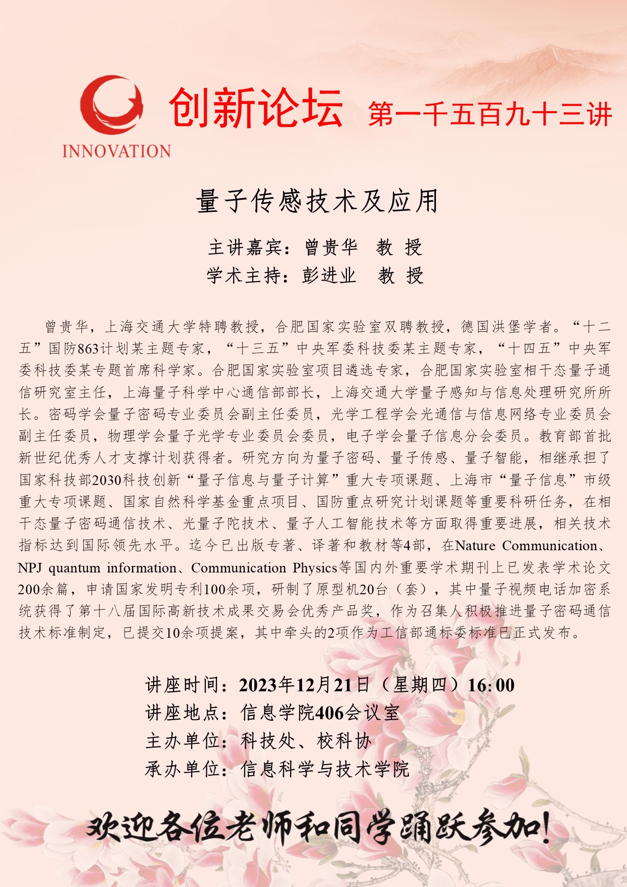 曾贵华 教授 开云手机网页版登录入口创新论坛第一千五百九十三讲:量子传感技术及应用 讲座时间 2023年12月21日(星期四)16:00 讲座地点 信息学院406会议室 讲座人介绍 曾贵华 教授 讲座内容