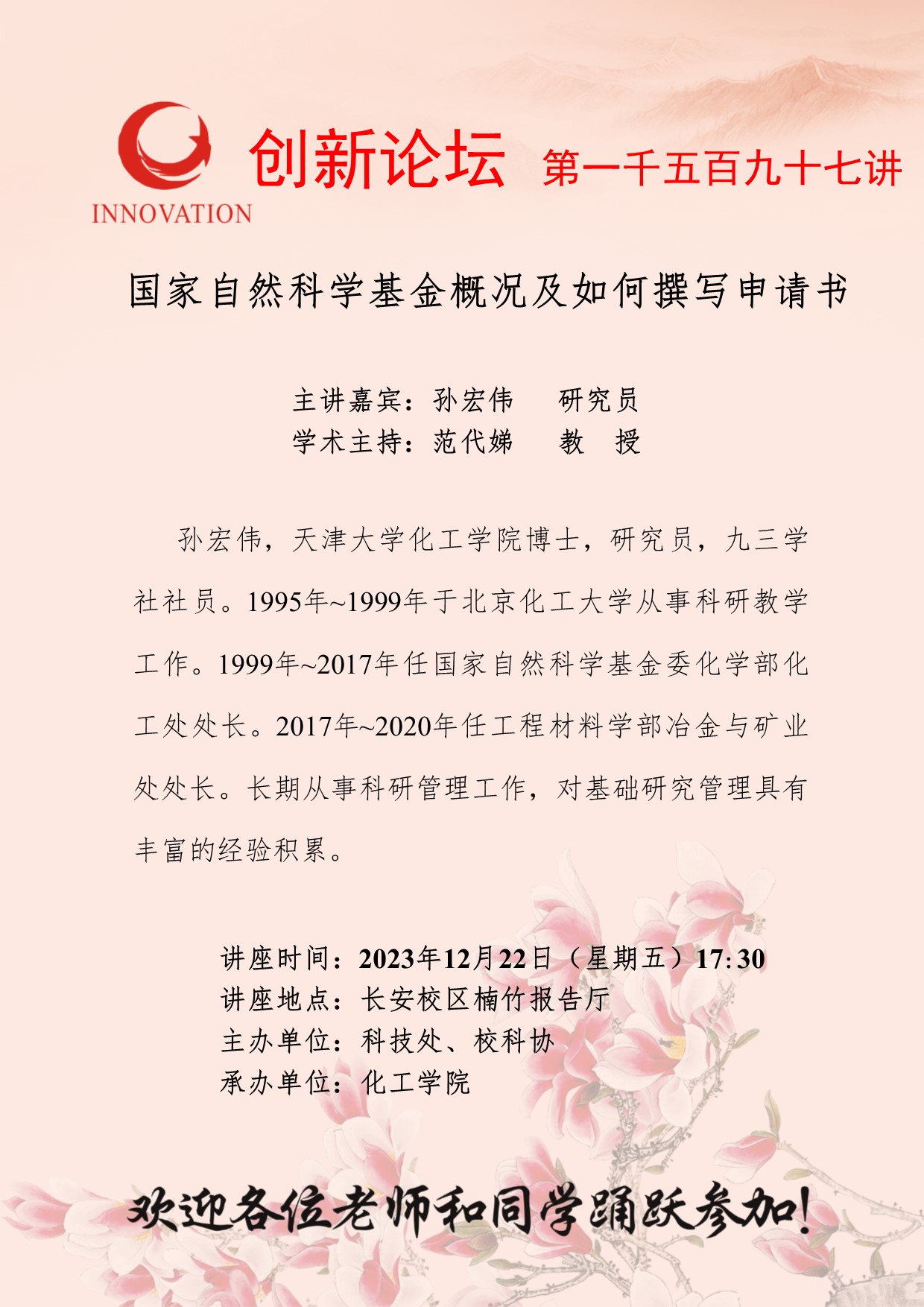 孙宏伟 研究员 开云手机网页版登录入口创新论坛第一千五百九十七讲:国家自然科学基金概况及如何撰写申请书 讲座时间 2023年12月22日(星期五)17:30 讲座地点 长安校区楠竹报告厅 讲座人介绍 孙宏伟 研究员 讲座内容