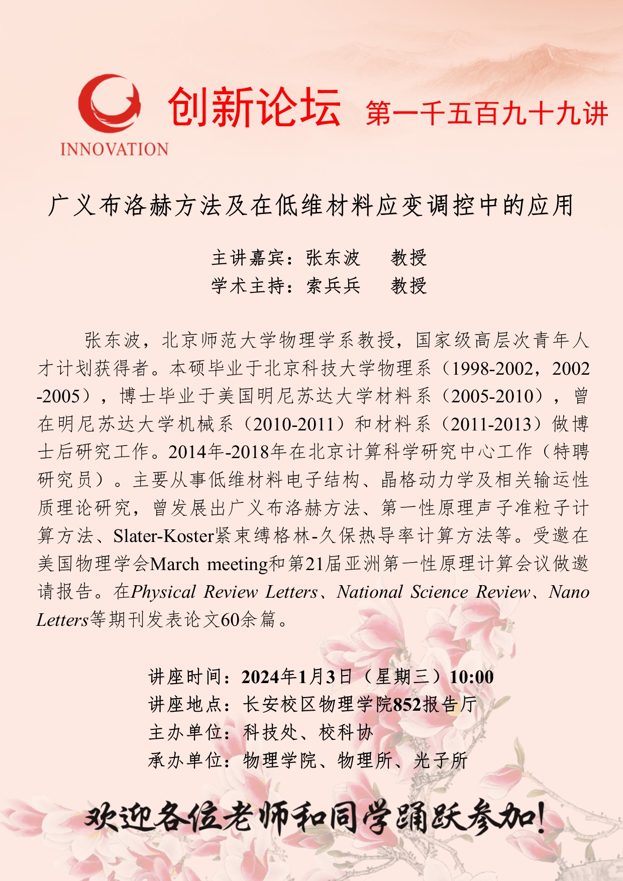 张东波 教授 开云手机网页版登录入口创新论坛第一千五百九十九讲:广义布洛赫方法及在低维材料应变调控中的应用 讲座时间 2024年1月3日(星期三)10:00 讲座地点 长安校区物理学院852报告厅 讲座人介绍 张东波 教授 讲座内容