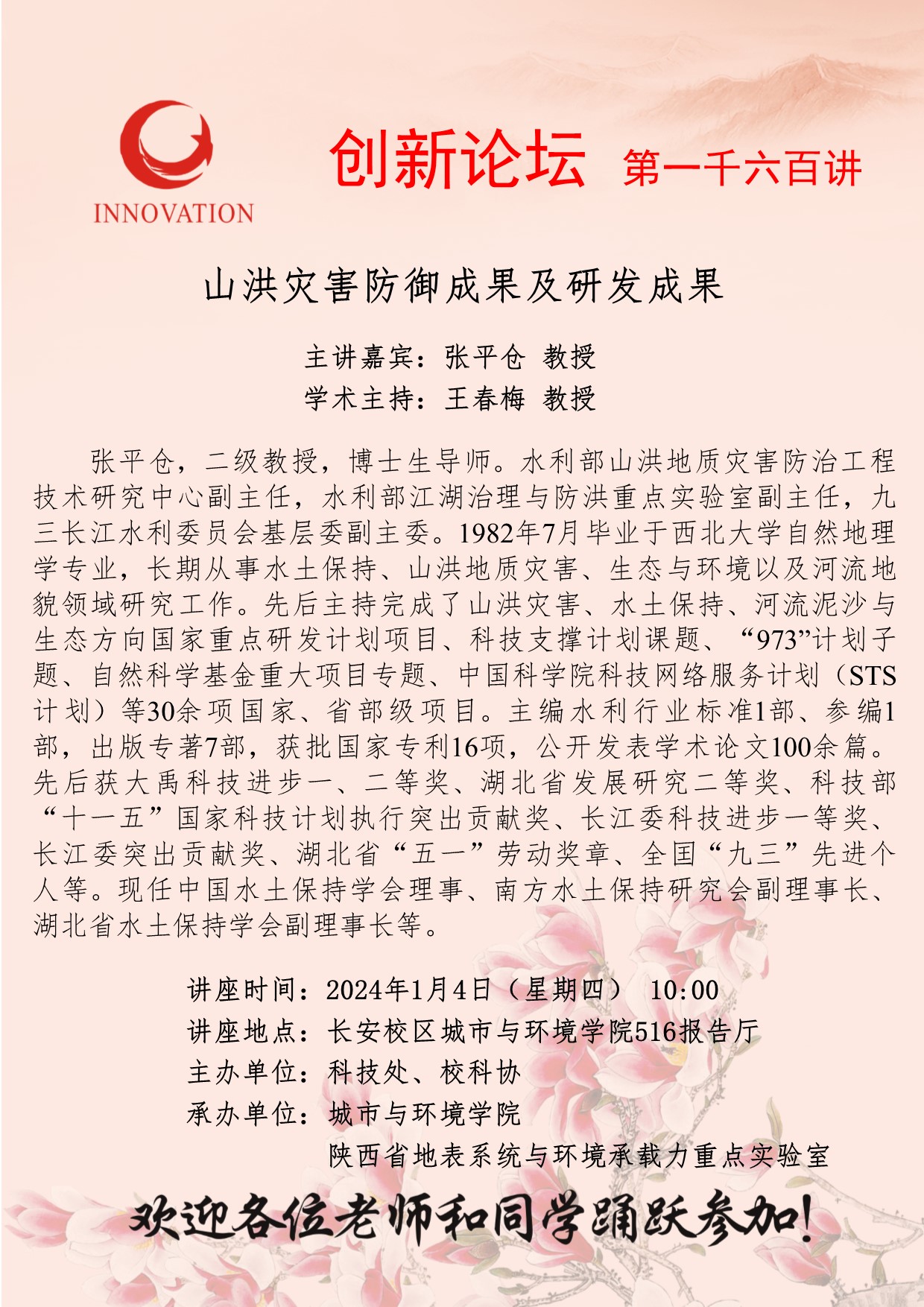 张平仓 教授 开云手机网页版登录入口创新论坛第一千六百讲:山洪灾害防御成果及研发成果 讲座时间 2024年1月4日(星期四) 10:00 讲座地点 长安校区城市与环境学院516报告厅 讲座人介绍 张平仓 教授 讲座内容