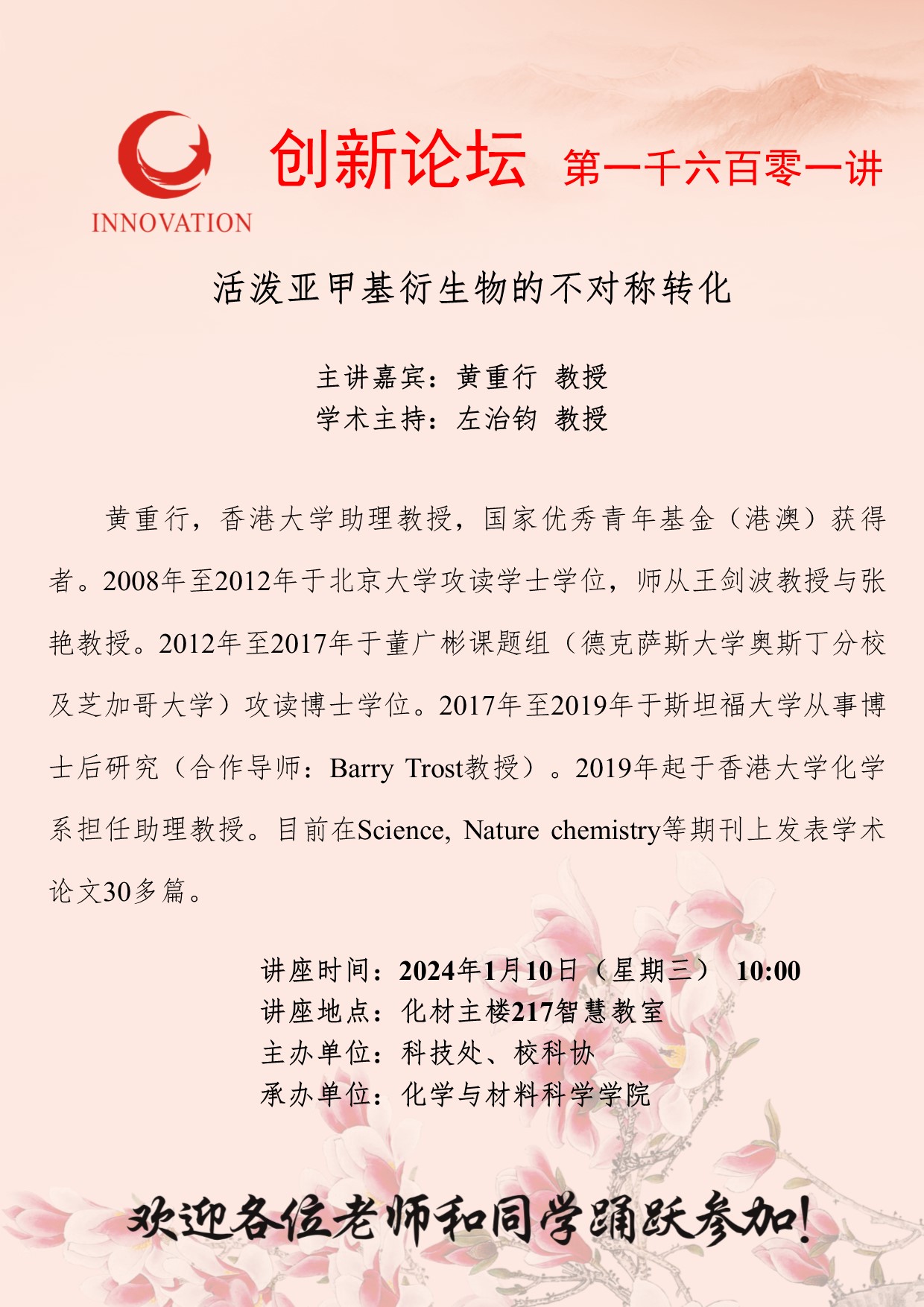黄重行 教授 开云手机网页版登录入口创新论坛第一千六百零一讲:活泼亚甲基衍生物的不对称转化 讲座时间 2024年1月10日(星期三) 10:00 讲座地点 化材主楼217智慧教室 讲座人介绍 黄重行 教授 讲座内容