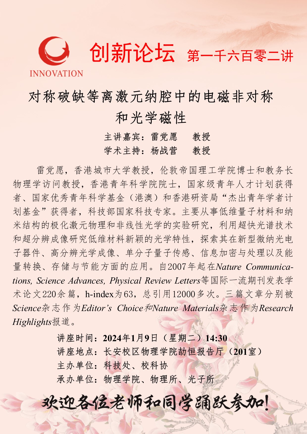 雷党愿 教授 开云手机网页版登录入口创新论坛第一千六百零二讲:对称破缺等离激元纳腔中的电磁非对称和光学磁性 讲座时间 2024年1月9日(星期二)14:30 讲座地点 长安校区物理学院劼恒报告厅(201室 讲座人介绍 雷党愿 教授 讲座内容