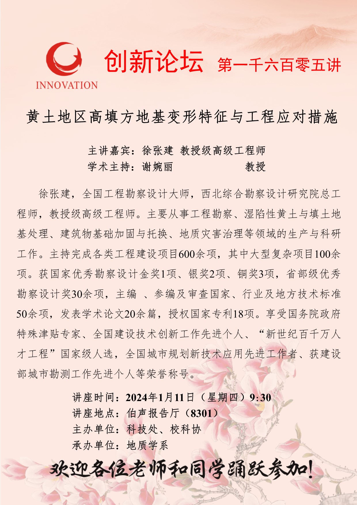 徐张建 教授级高级工程师 开云手机网页版登录入口创新论坛第一千六百零五讲:黄土地区高填方地基变形特征与工程应对措施 讲座时间 2024年1月11日(星期四)9:30 讲座地点 伯声报告厅(8301) 讲座人介绍 徐张建 教授级高级工程师 讲座内容